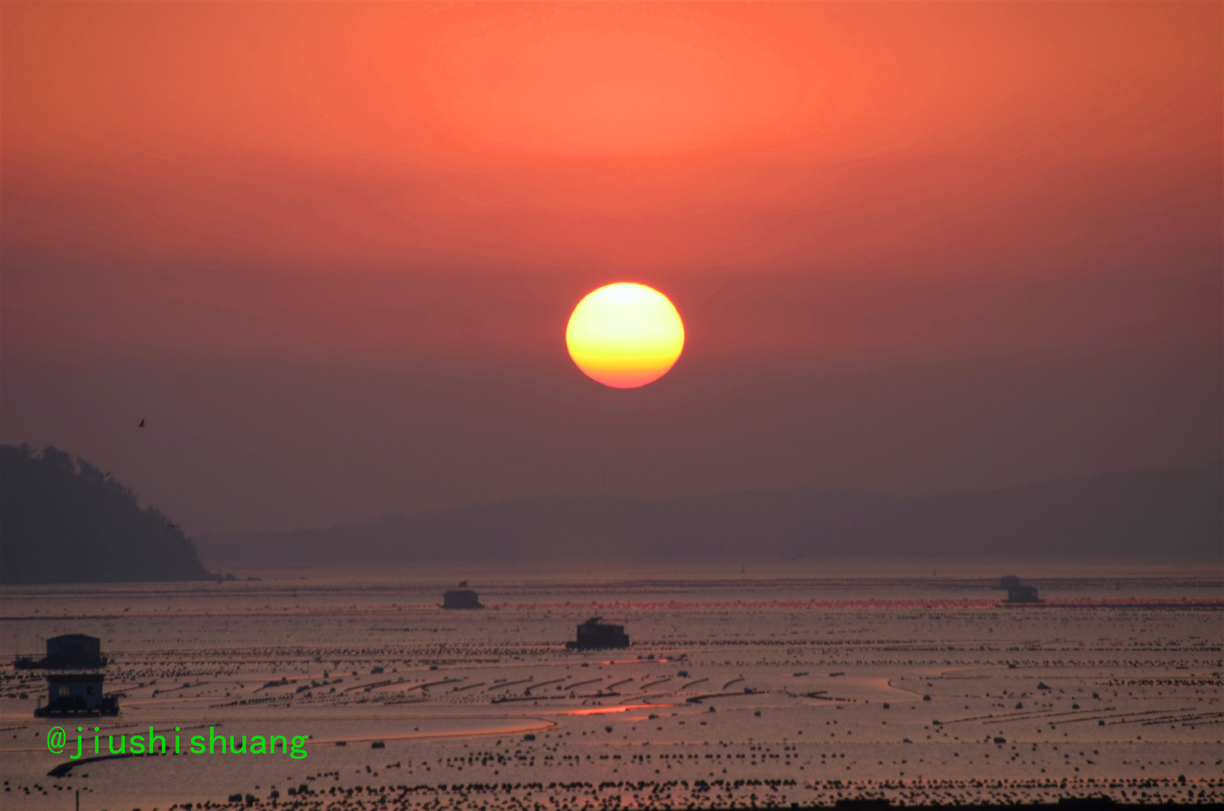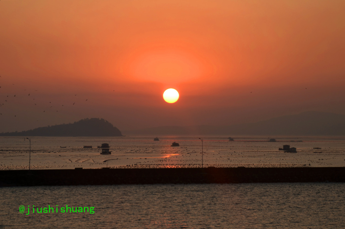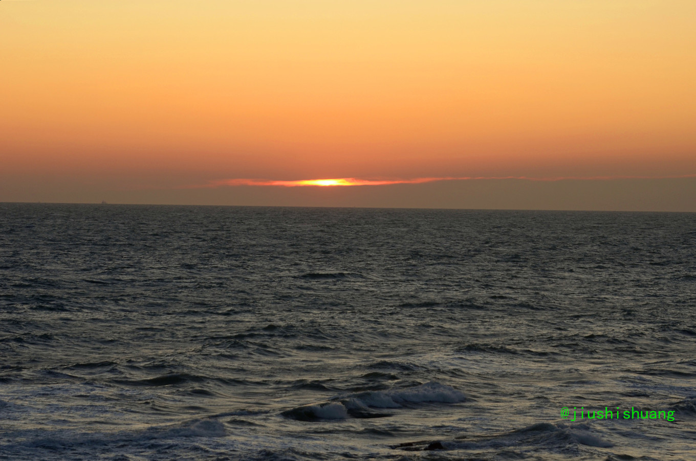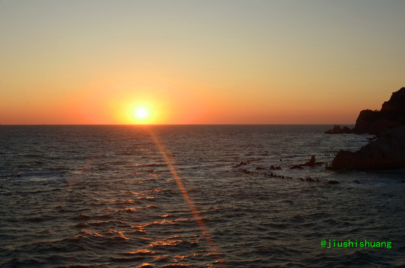 ☆ 年9月22日 晴,預(yù)報(bào)日出時(shí)間5:45分,五點(diǎn)半我們走到南北長(zhǎng)山大橋,這時(shí)東邊黃海海面上浮起一片魚(yú)肚白,海面漸漸亮了起來(lái),過(guò)了一會(huì)兒,天水相接的地方出現(xiàn)了一道發(fā)亮的橙色光帶,周圍的人們說(shuō)太陽(yáng)此時(shí)已從海面升起,因晨霧的遮擋,我們未能看到的太陽(yáng)跳出海面的一剎那。雖然如此,看到太陽(yáng)噴薄而出的一瞬間,我們?nèi)匀环浅<?dòng),耀眼絢爛的陽(yáng)光照亮了海面,也照亮了我的心。