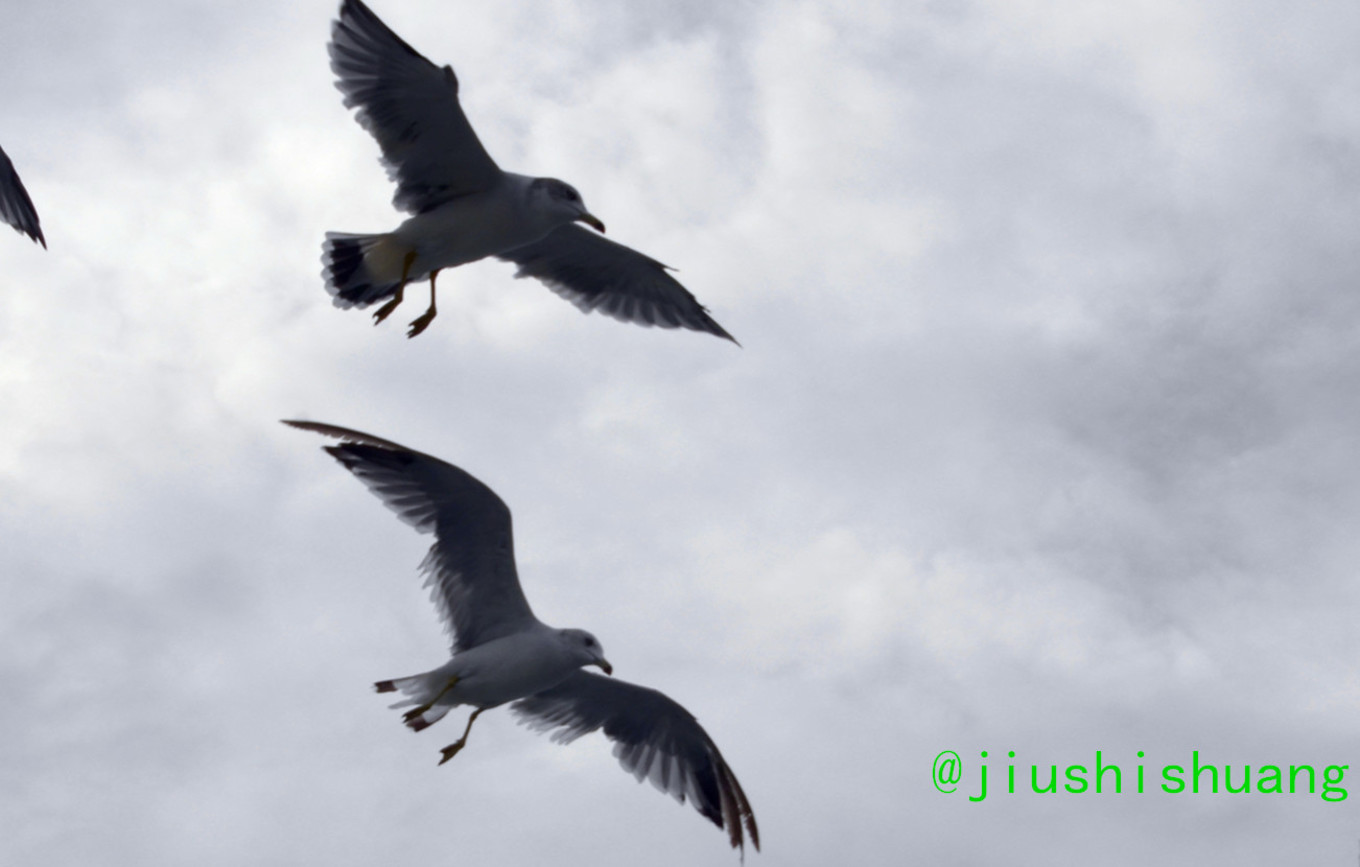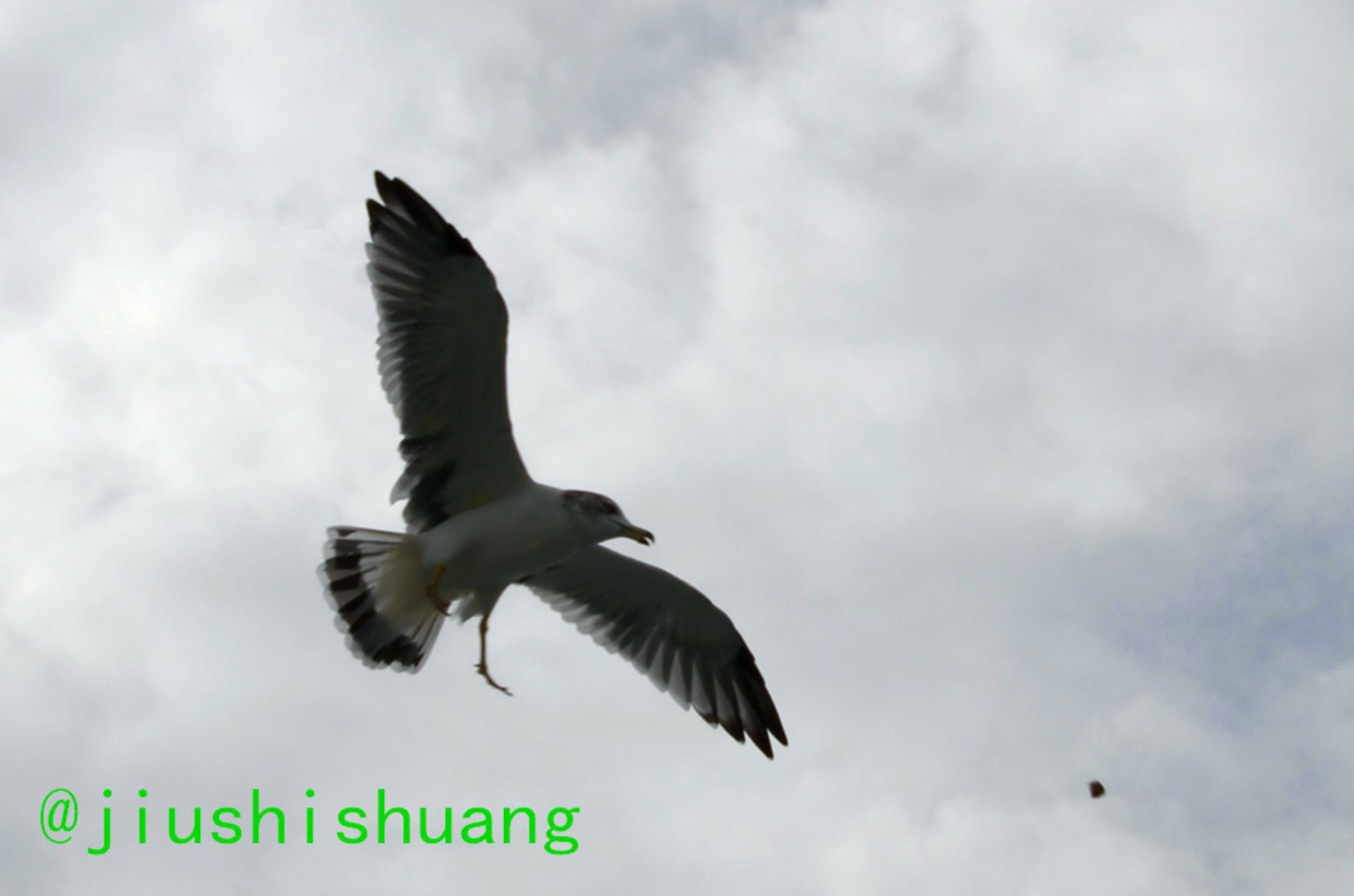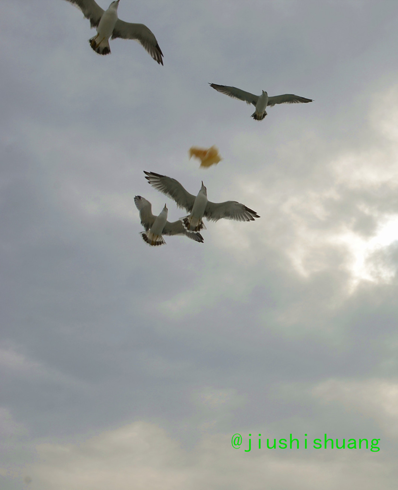 海上游不光是看??淳?,還有就是看鳥(niǎo)。九月份長(zhǎng)島的10萬(wàn)多只候鳥(niǎo)已經(jīng)遷移,隨船海鷗還是有的,我們?yōu)榱丝带B(niǎo)喂鳥(niǎo),特意升艙,站在上層甲板上仰頭觀看,成群海鳥(niǎo)在我們頭上飛來(lái)飛去,大家喂鳥(niǎo)的火腿腸用完了,就拿出從北京帶的火燒烙餅喂鳥(niǎo),請(qǐng)欣賞一下鳥(niǎo)與火腿腸烙餅漫天飛的場(chǎng)面吧。