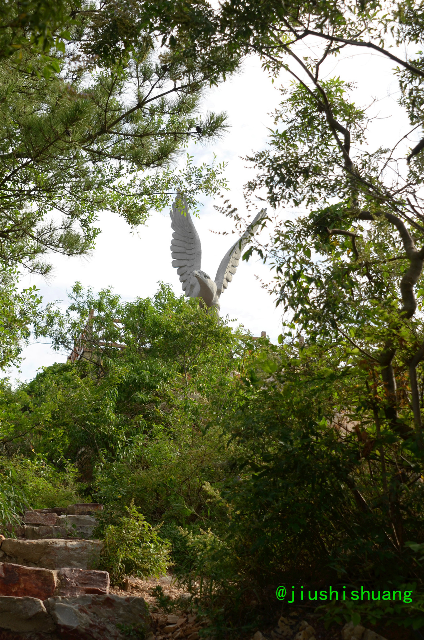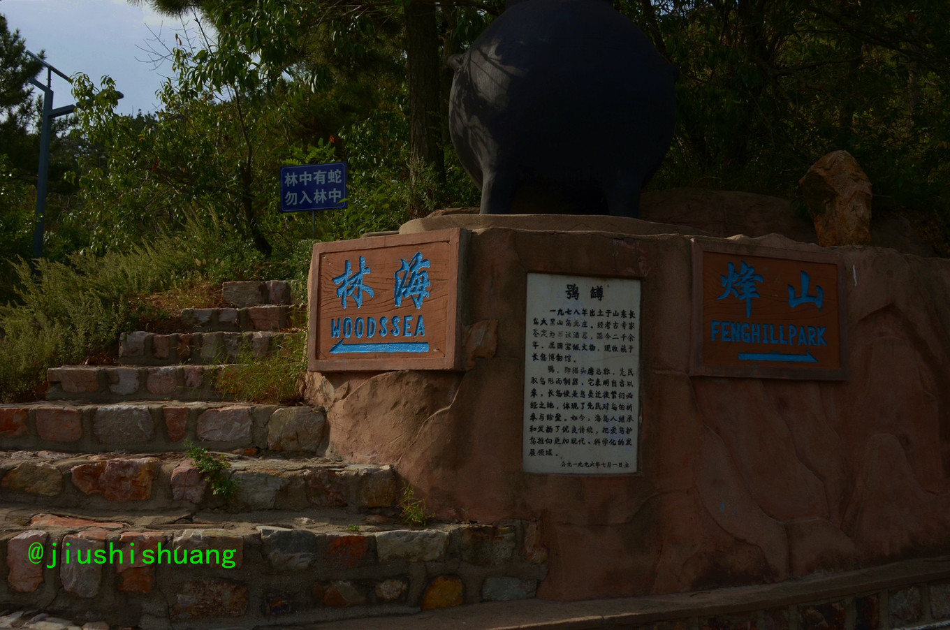 烽山林海位于南長(zhǎng)山島的最南端,是相連相通的兩個(gè)景區(qū)。烽山景區(qū)內(nèi)山巒起伏,松濤綠浪,極高的負(fù)氧離子含量令空氣格外清新。玩烽山景區(qū),需要坐電瓶擺渡車上山,如果體力好,時(shí)間充裕,步行上山更適合攝影觀景,我們考慮到自身體力,選擇了坐擺渡車上山步行下山。烽山的地標(biāo)景點(diǎn)是山上的展翅雄鷹。