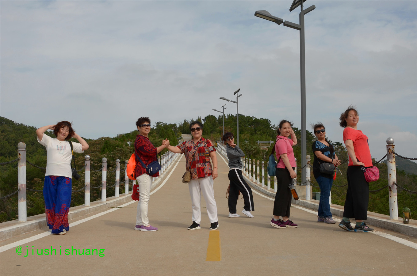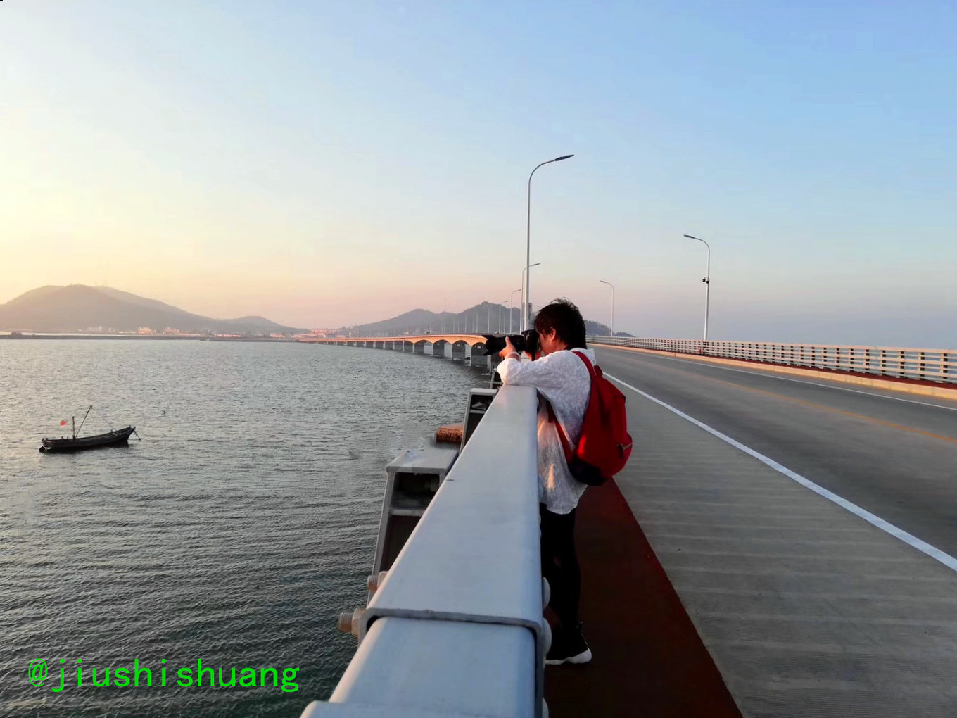 南北長(zhǎng)山大橋跨海連接南北長(zhǎng)山島,橋長(zhǎng)1240米,寬15米。從金鈺家緣到大橋步行十五分鐘,由于多云天氣,我們走到大橋處未能看到日落。