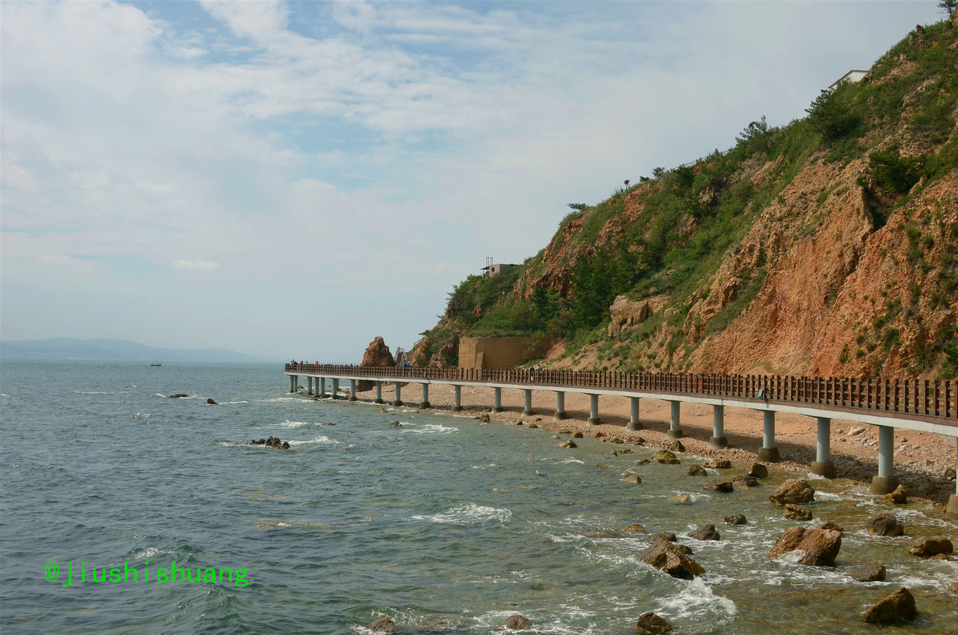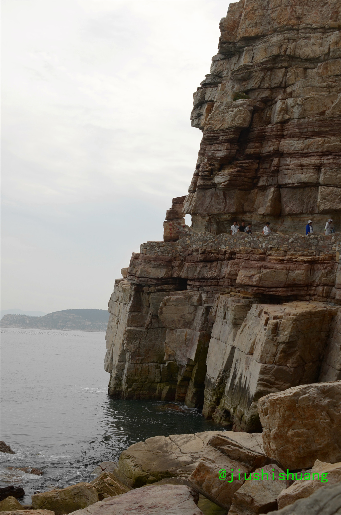 龍爪山高峻險(xiǎn)峭,巨石嶙峋。峭壁斷崖的腰部有一條世界最長(zhǎng)且極為罕見(jiàn)的天然海蝕棧道。走在海蝕的天然棧道上,我們感受著大自然的鬼斧神工,奇、險(xiǎn)、美,一步一景,經(jīng)過(guò)將軍石、石門,海蝕棧道被一片嶙厲的巖石阻斷,只好沿著天梯石階上行,爬上山頂居高臨下俯瞰大海,風(fēng)景這邊更好。