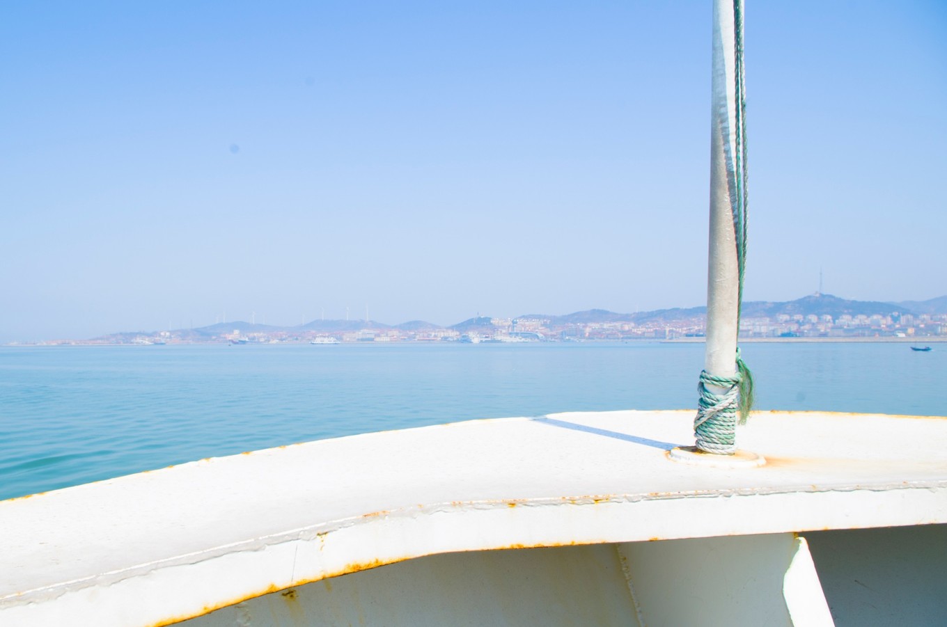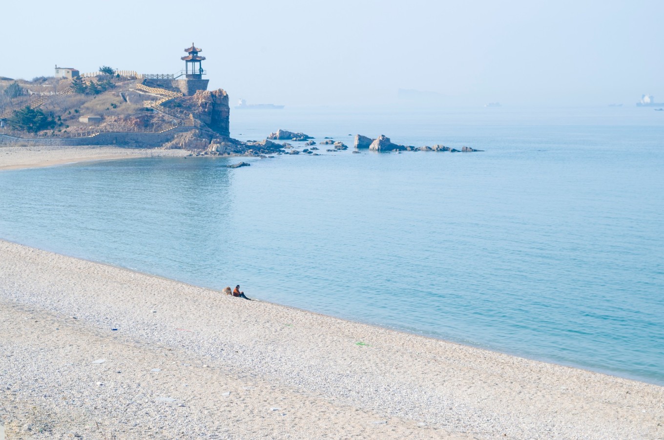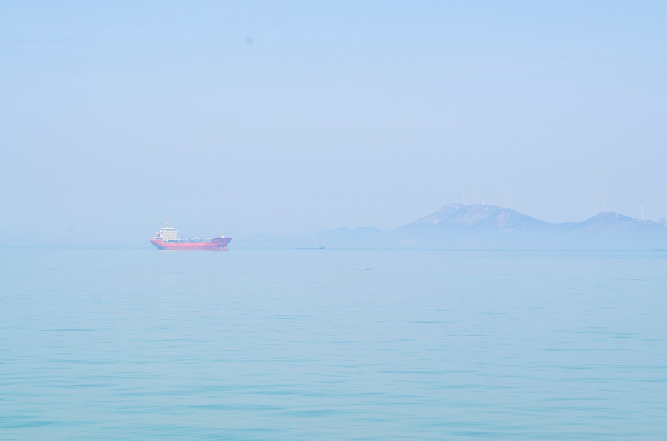 中午的時候,海面上還有些霧氣。遠方的海面上有條紅色的船,襯著看得不太清楚的水汽,也多出來幾分藝術家的氣質(zhì)。