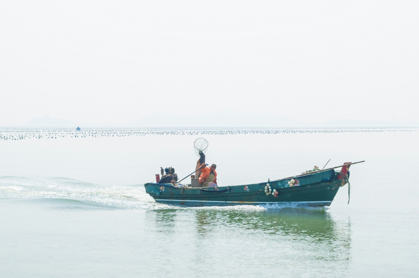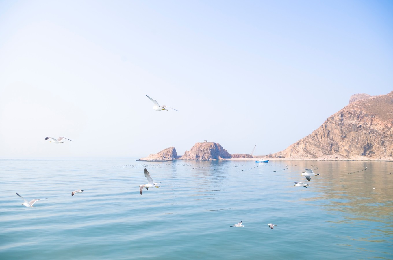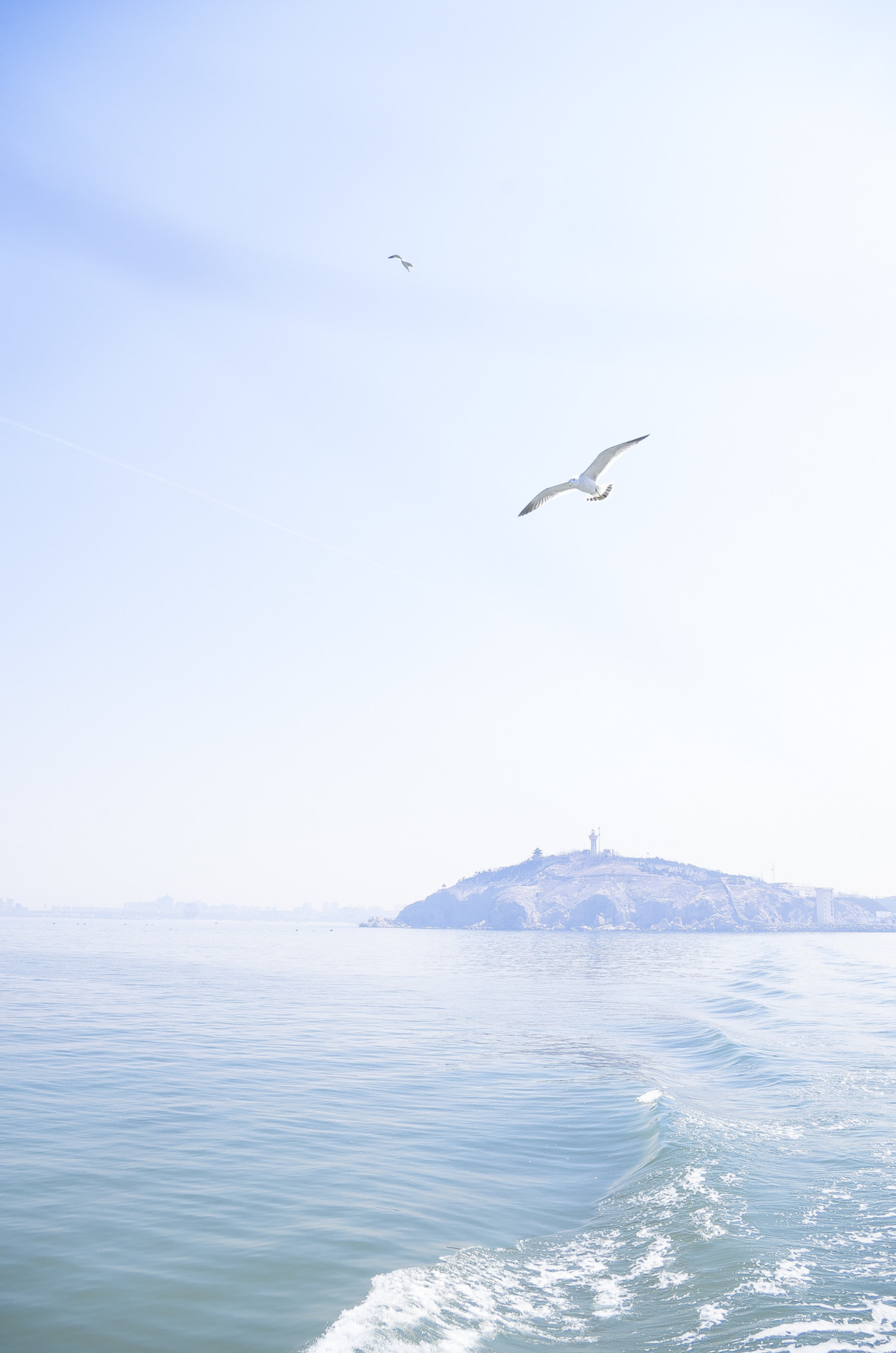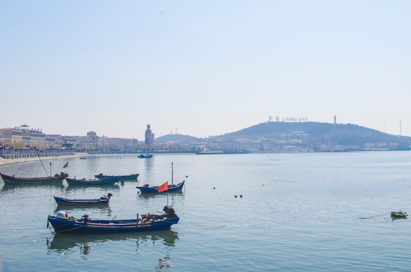 中午的時候,海面上還有些霧氣。遠方的海面上有條紅色的船,襯著看得不太清楚的水汽,也多出來幾分藝術家的氣質(zhì)。