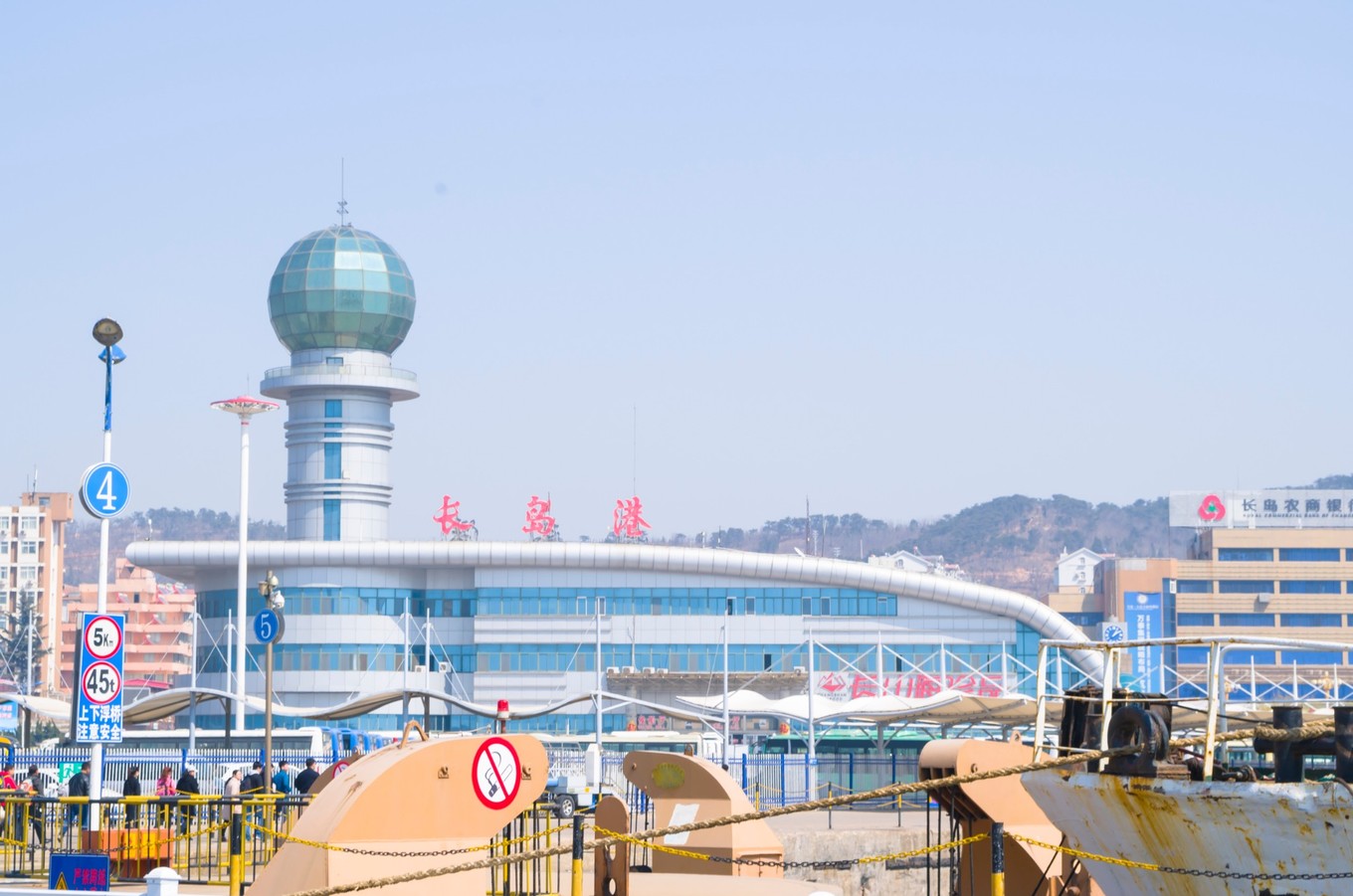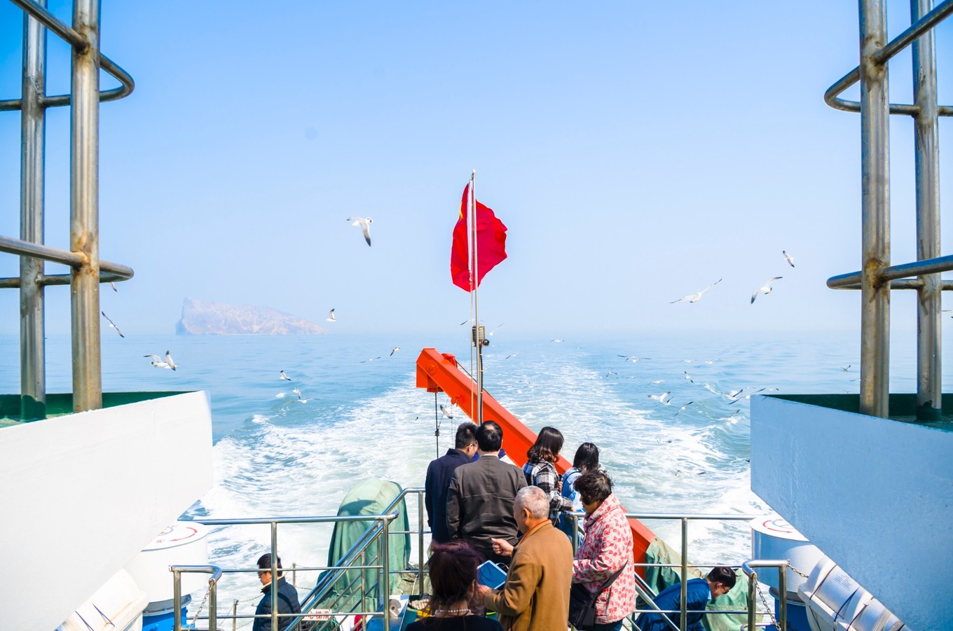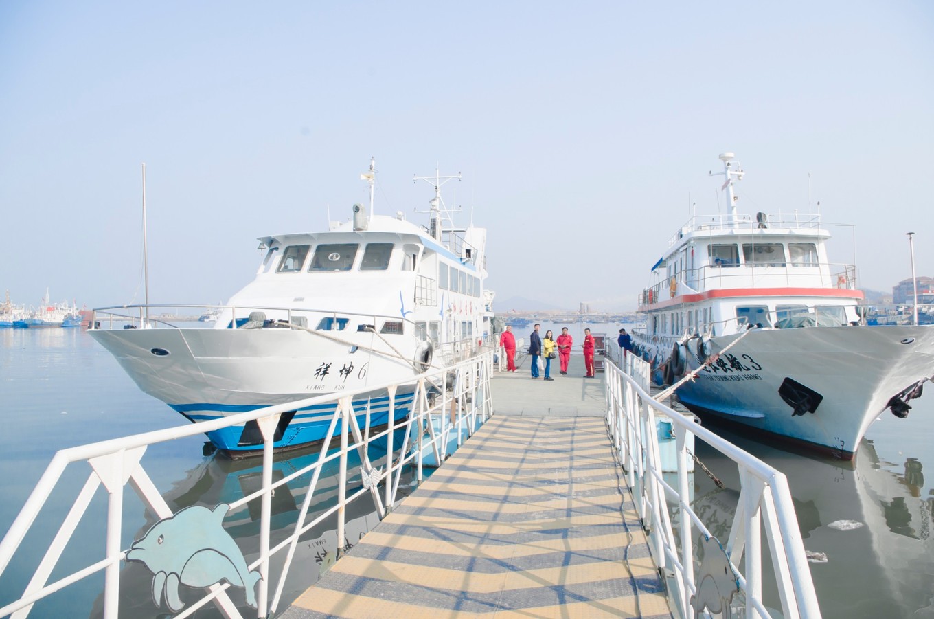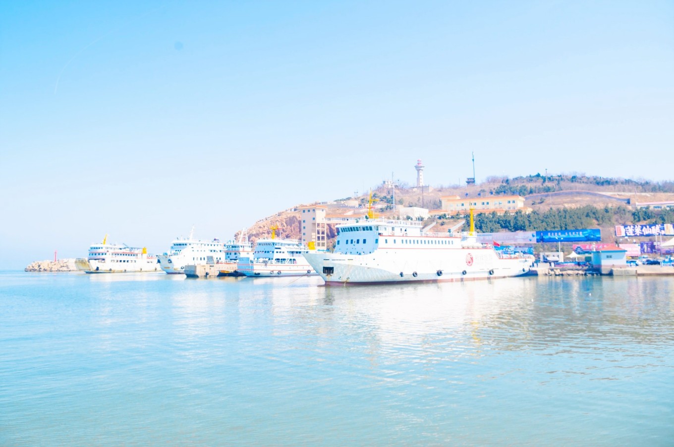 徐州晚上的火車到煙臺已是十點多了,出了火車站我們便提前約了司機,直接上蓬萊港了。蓬萊港的附近就是蓬萊閣(四大名樓之一,其他三個:黃鶴樓、滕王閣與岳陽樓),還有個海洋世界。我們還是先打算買票過去,蓬萊港只售臨近的航班的票,所以買完票基本上就要直接上船了。另如果不需要保險的話,一定要說不要保險,不然工作人員都是默認的。30/人,保險3/人,30+min。
