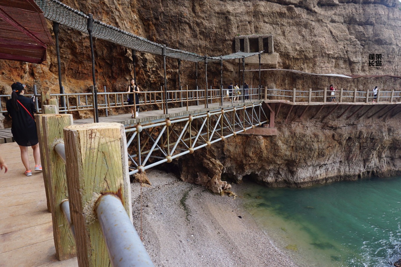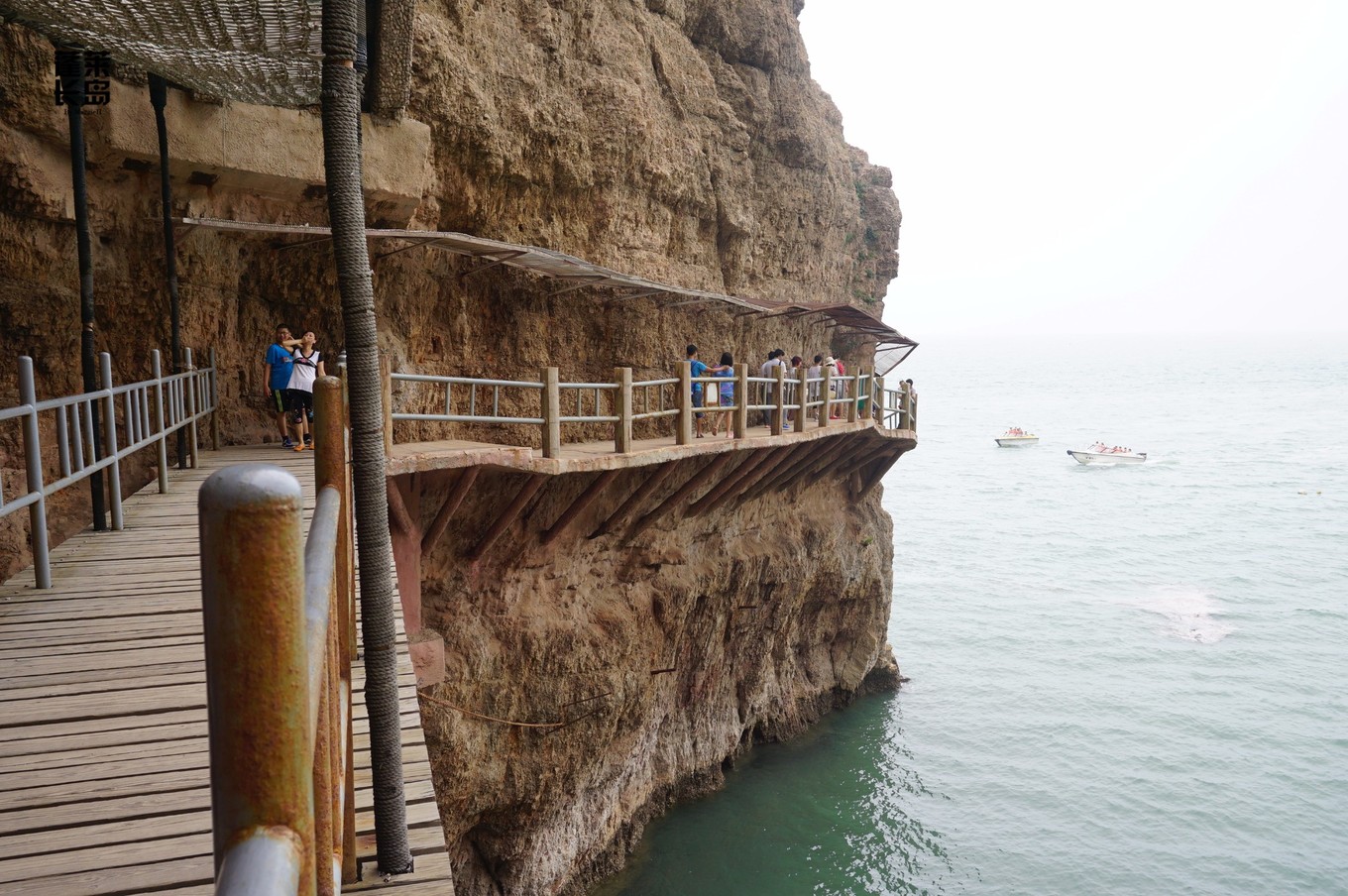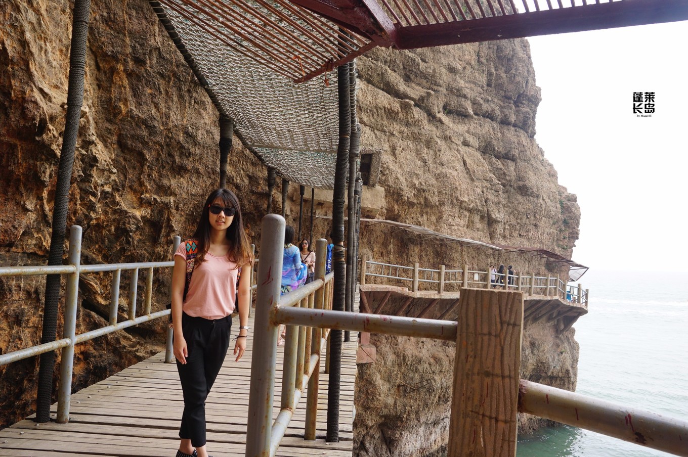 這里是被稱為膠東一絕的田橫棧道。棧道全長220米,高2米,離崖壁地面20米,東起回仙洞,西抵老虎洞。這條棧道,使珠璣巖的懸崖絕壁成了坦途。游人行于棧道,如同凌波漫步,腳踏萬頃碧濤,頭頂危巖絕壁,既驚險又刺激。在這里依崖觀海,煙波浩淼,撫今懷古,情趣盎然。