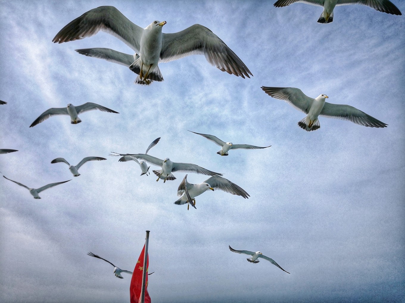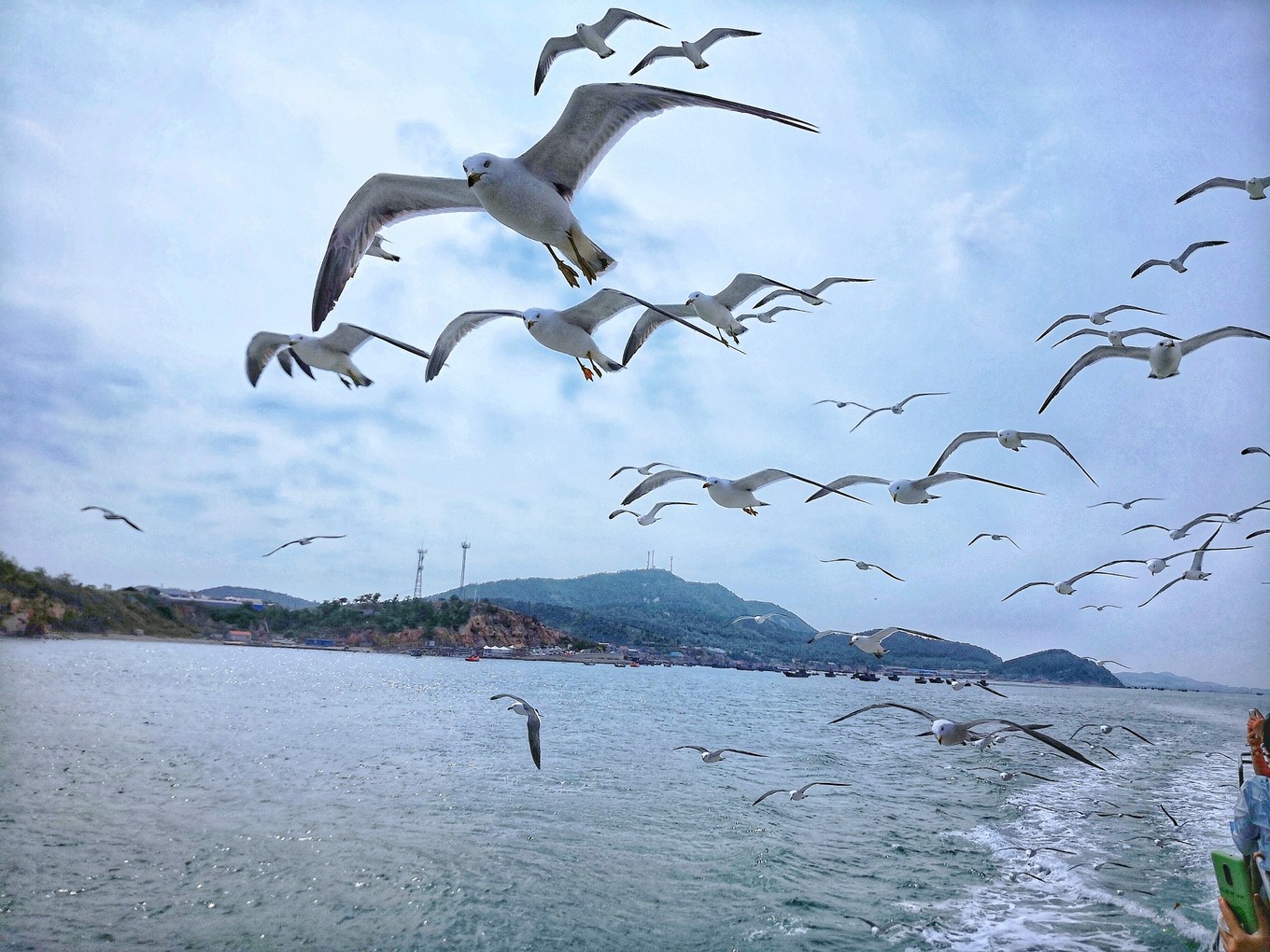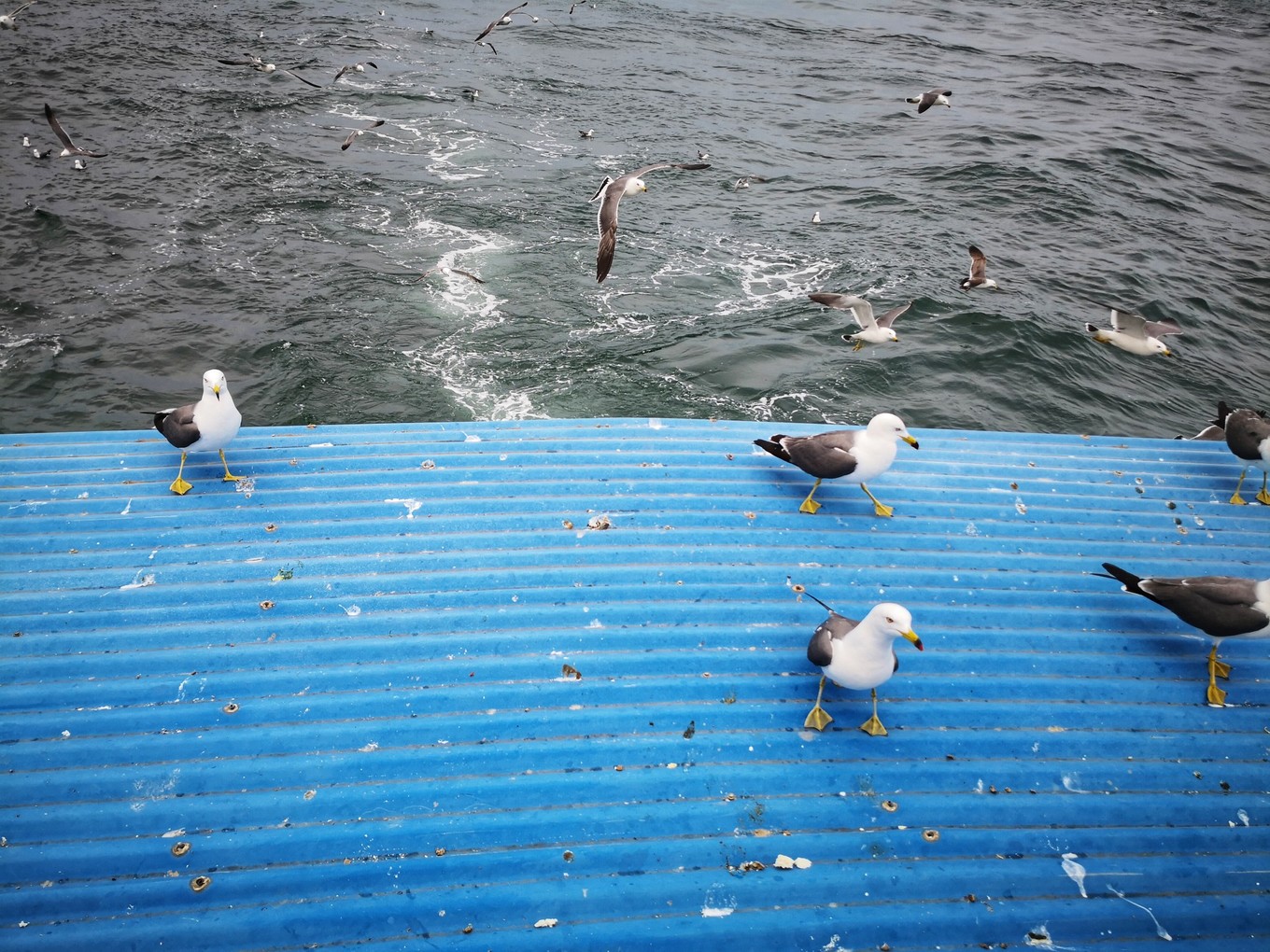 因?yàn)橐獩_過去叼魚腸,海鷗一般會(huì)比游船的速度快,所以它們飛到船頭會(huì)掉頭回船尾排隊(duì)沖過來進(jìn)行下一次叼食。