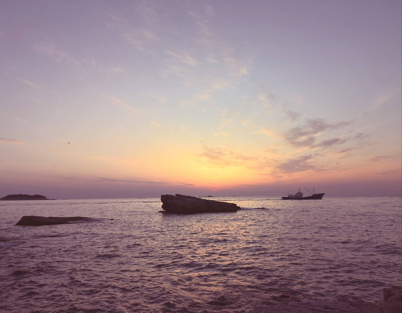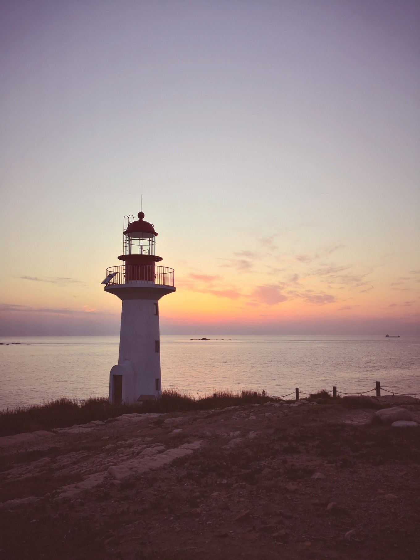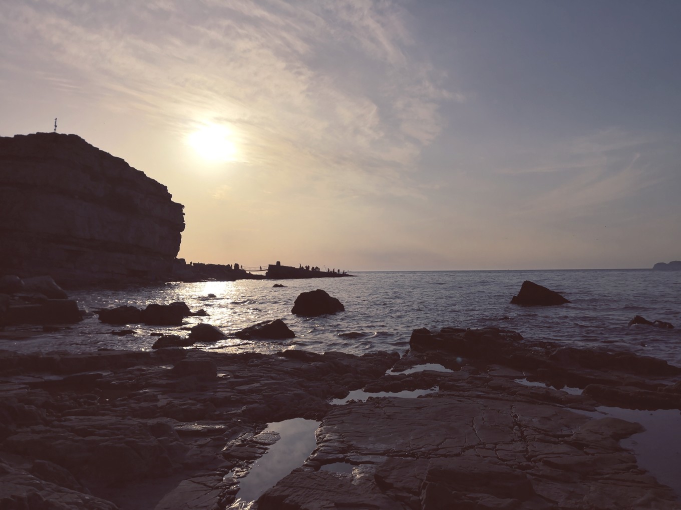 離開月牙灣去九丈崖的時(shí)候已經(jīng)累成狗了,畢竟在鵝卵石上走了將近兩個(gè)小時(shí)。所以看到九丈崖的n多臺(tái)階時(shí)內(nèi)心基本是崩潰的。我們大概五點(diǎn)半到九丈崖,夏天日落比較晚,我們一路走走歇歇基本快七點(diǎn)才到眺望臺(tái),找了塊視角不錯(cuò)的礁石,坐在上面看日落,等了好久才等到日落。天氣不錯(cuò),特別給力,沒有下雨沒霧氣。日落很美,太陽把云彩染成了溫柔的粉色。太陽接近海面后,過了不到一分鐘就完全落下去了,現(xiàn)場(chǎng)看到真的很震撼,不枉我們餓著肚子看完日落。日落后返程的時(shí)候才發(fā)現(xiàn)珍珠港前面山坡上的燈塔附近看落日視野更好,建議大家不要都擠在眺望臺(tái)的礁石上,后面的視角更好呢。