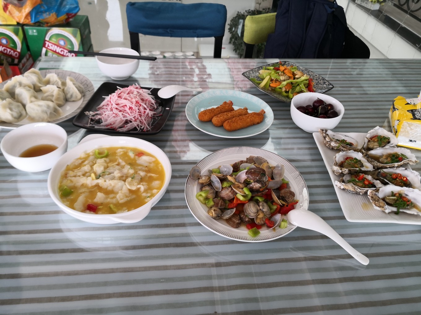 晚餐加住宿。晚餐真的超級(jí)豐盛呀,老板娘冷大姐給我們兩個(gè)人準(zhǔn)備了十盤菜,海鮮特別新鮮,肉質(zhì)鮮美。怒贊黃花魚、鮑魚、海膽和生蠔。大姐調(diào)的醋汁和蘸料味道很好,給海鮮增味了不少。六月剛好是蓬萊的休漁期,但是漁家還可以在近海小規(guī)模打魚,所以海鮮依然是很新鮮的,比養(yǎng)殖的更好吃。我們甚至在扇貝中看到了扇貝生前吃下的小螃蟹,小螃蟹殼是軟的,里面基本沒肉,但是咬開能吃到很嫩的蟹黃,太有意思了。給海膽一萬字好評(píng)!