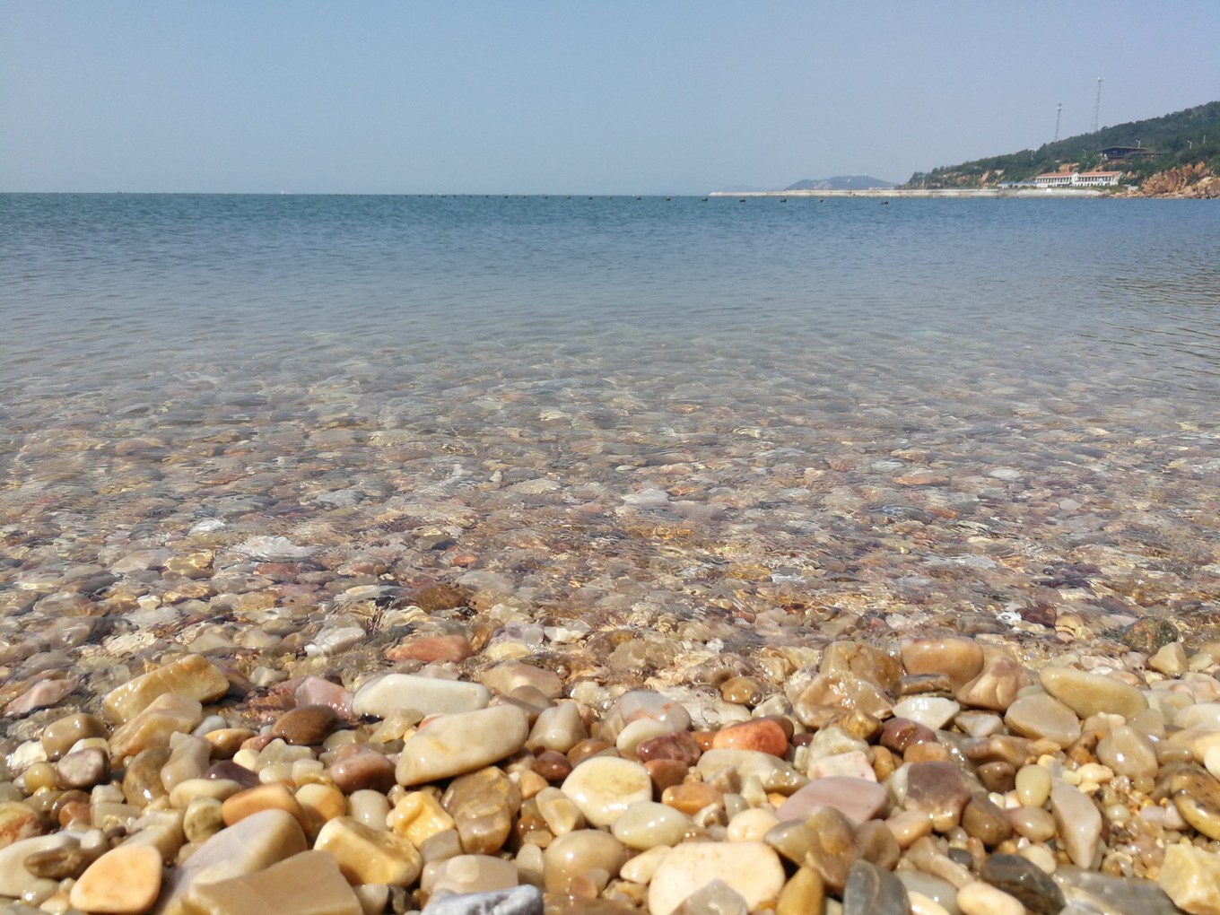 藍色海水晶瑩剔透,白色浪花溫柔撫摸球石,圓潤五彩的球石在陽光下熠熠生輝、五彩斑斕