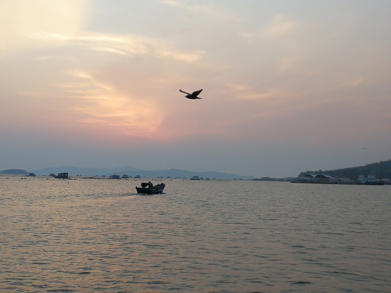 漁船歸航,海鷗起舞,紅霞灑向海面,溫暖寧靜,絢爛卻悠然