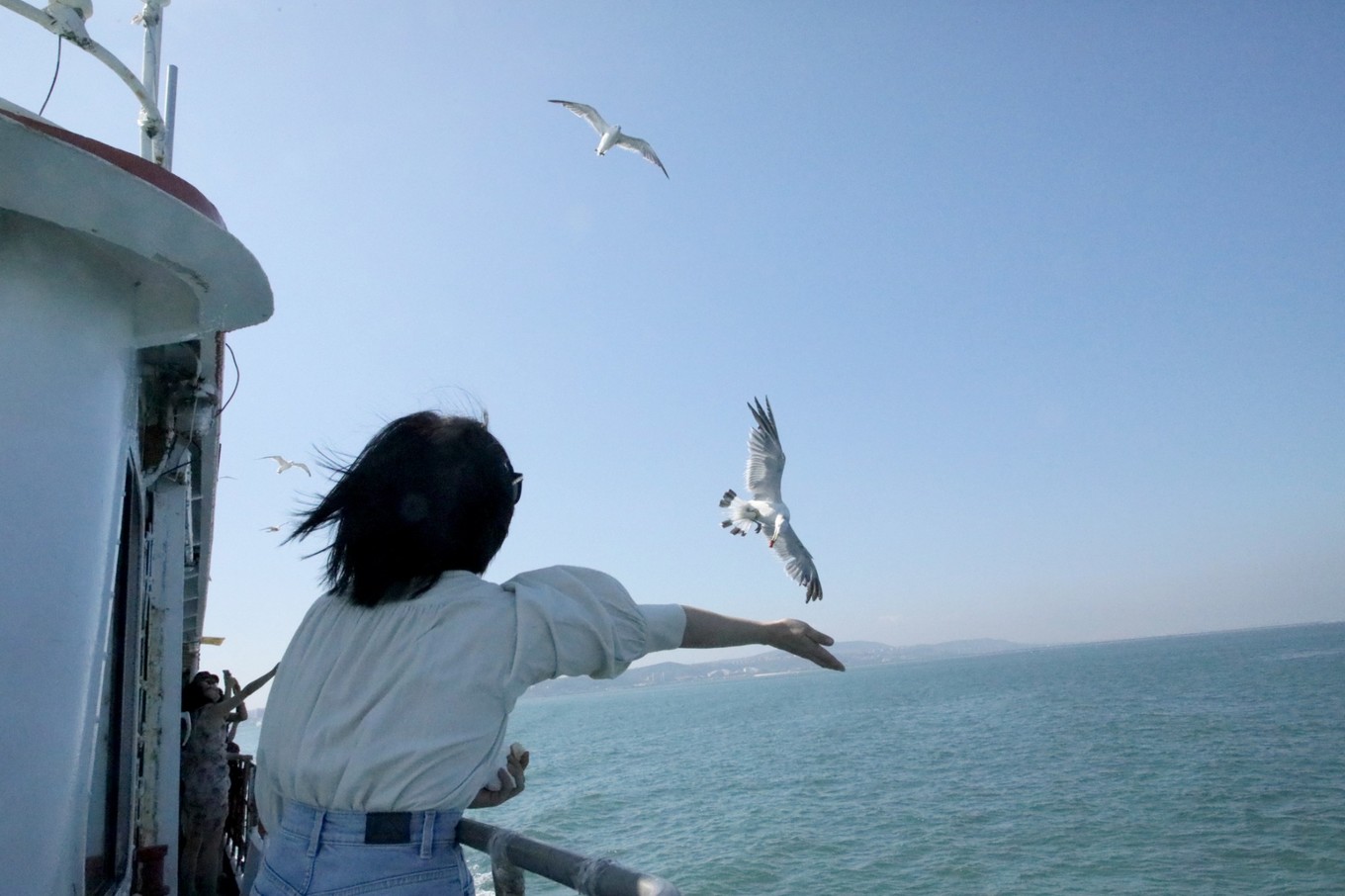 終于出發(fā)啦?。?!在工作人員的吆喝下升了艙,好像是25元/人,視野更廣,兜風(fēng)更爽,咩哈哈哈哈哈。早就聽說(shuō)在乘船的時(shí)候會(huì)有海鷗跟隨,可以準(zhǔn)備些小面包來(lái)喂海鷗,所以我就準(zhǔn)備了2個(gè)小面包。看著海鷗圍過(guò)來(lái),開心得像個(gè)200斤的孩子。