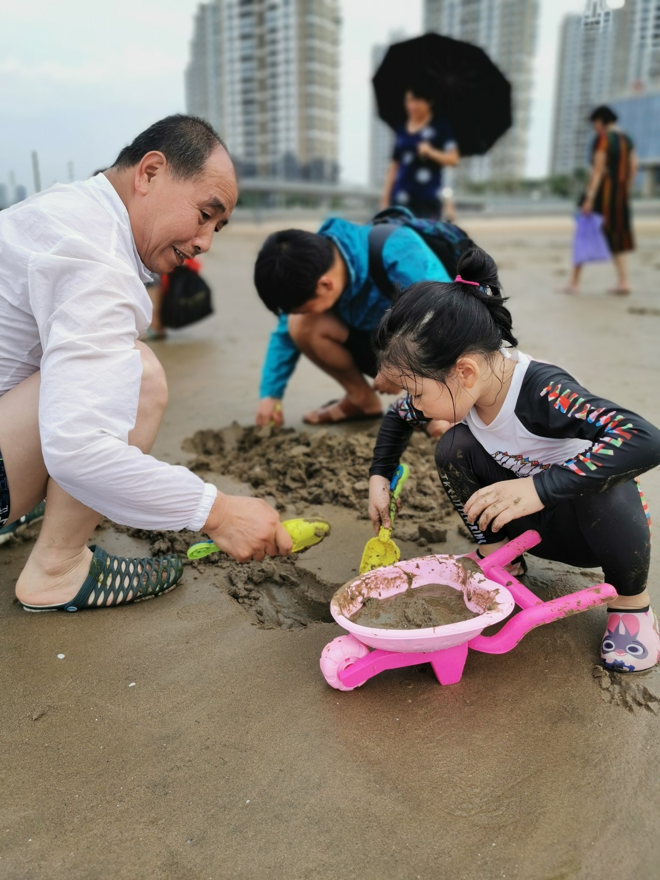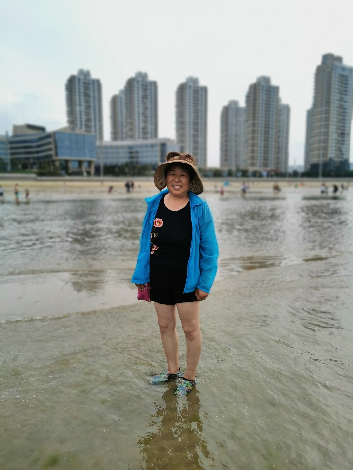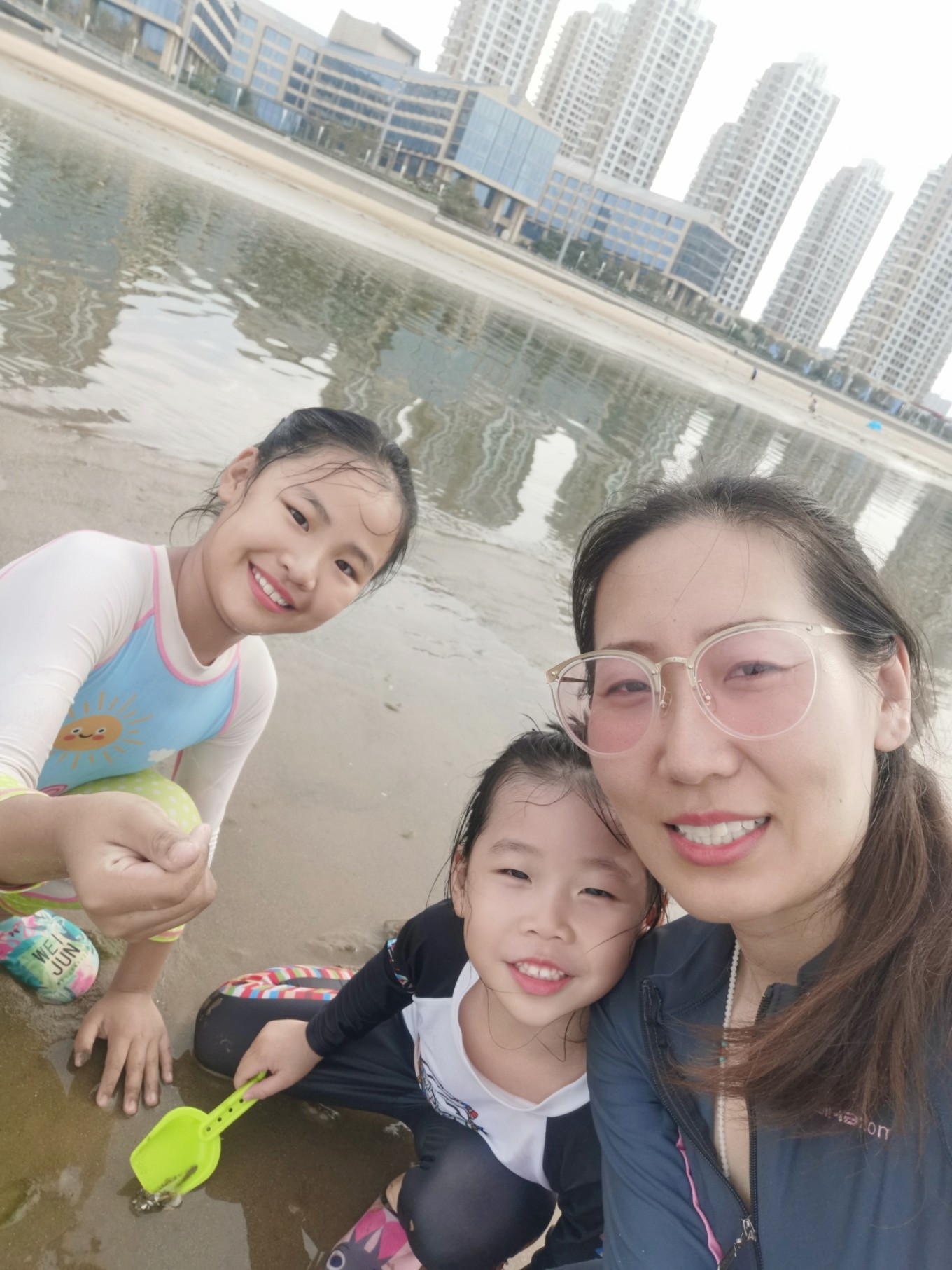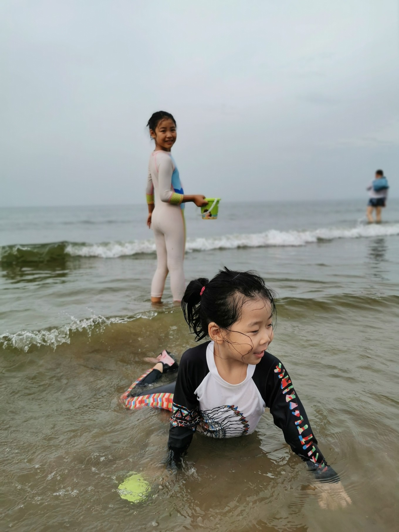 小姐倆都不休息,直接換上泳衣去海邊玩。