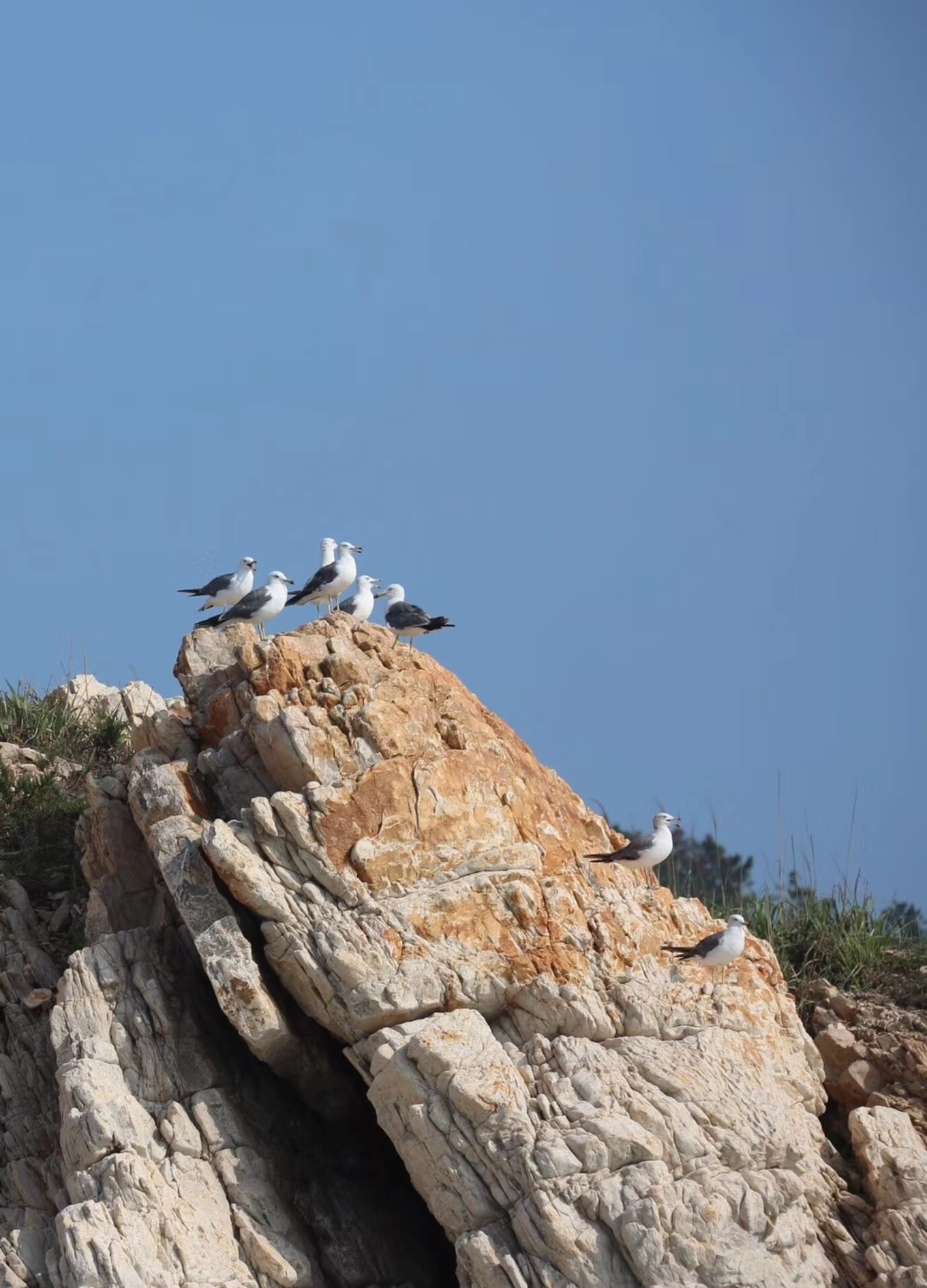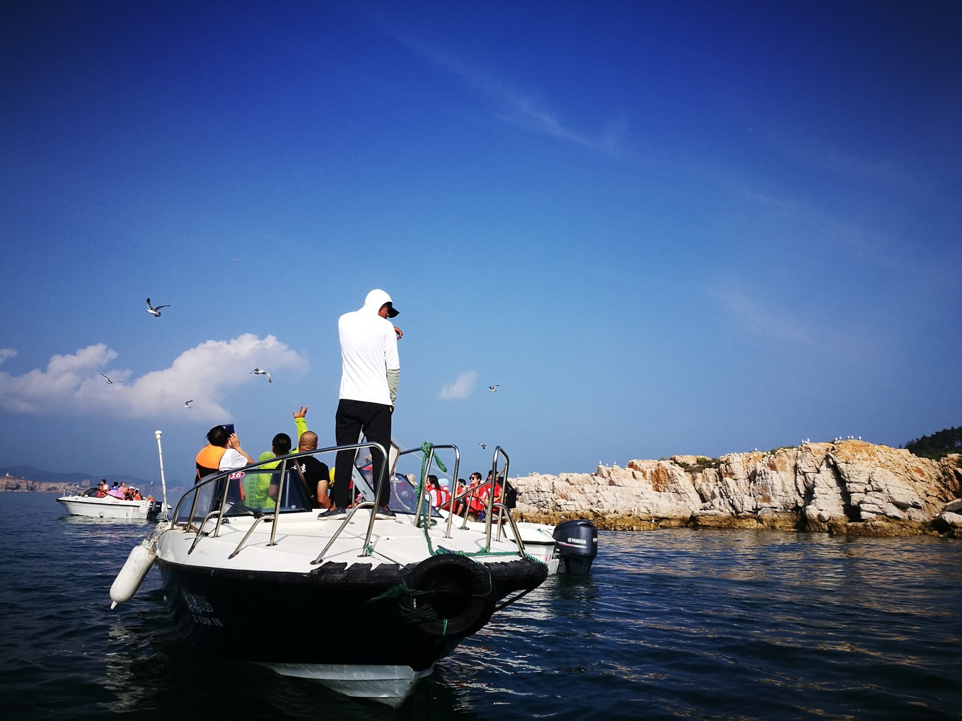 早上吃過飯后,于老板開車送我們到了快艇碼頭,游艇票200元/人,于老板代買的,他買便宜,掙個(gè)差價(jià)。游艇的路線是:游艇碼頭-萬鳥島喂海鷗-擋浪島下船游玩20分鐘-遙望寶塔礁(一帆風(fēng)順)-遙望龍爪山-登錄廟島游玩30分鐘-返回游艇碼頭。