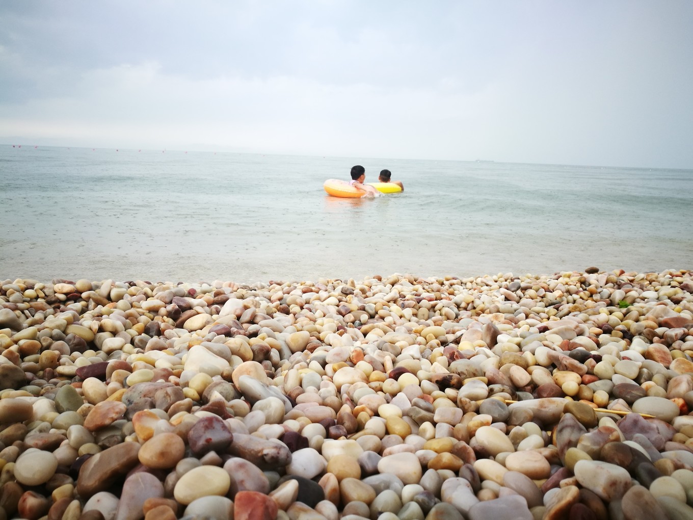 照片的左側(cè)是黃海,海水略黃,波濤洶涌,推動(dòng)著球石前后滾動(dòng),發(fā)出清脆悅耳的聲音。右側(cè)是渤海,風(fēng)平浪靜,海水是深藍(lán)色,據(jù)說兩邊海水鹽度不同造成的。