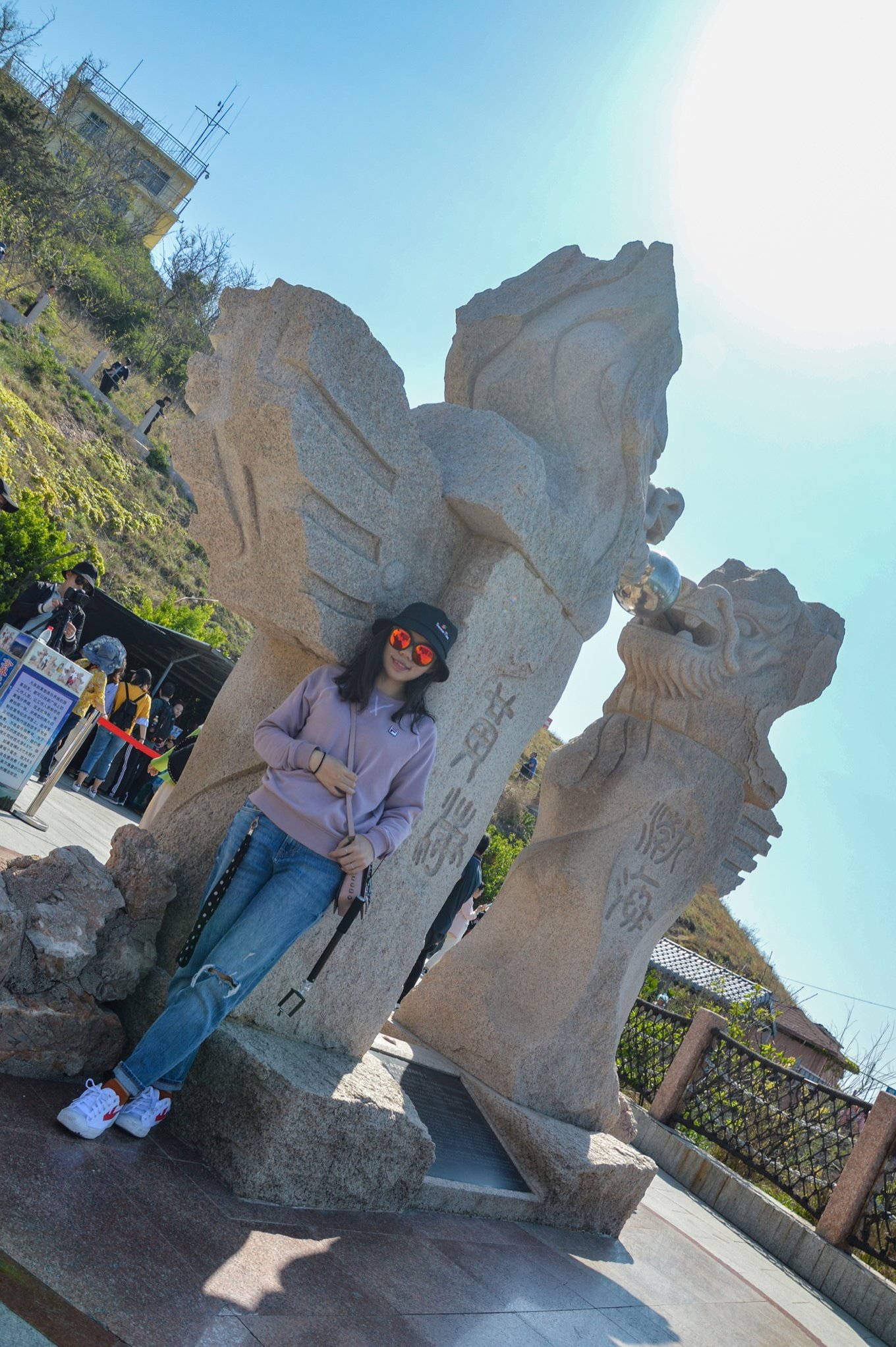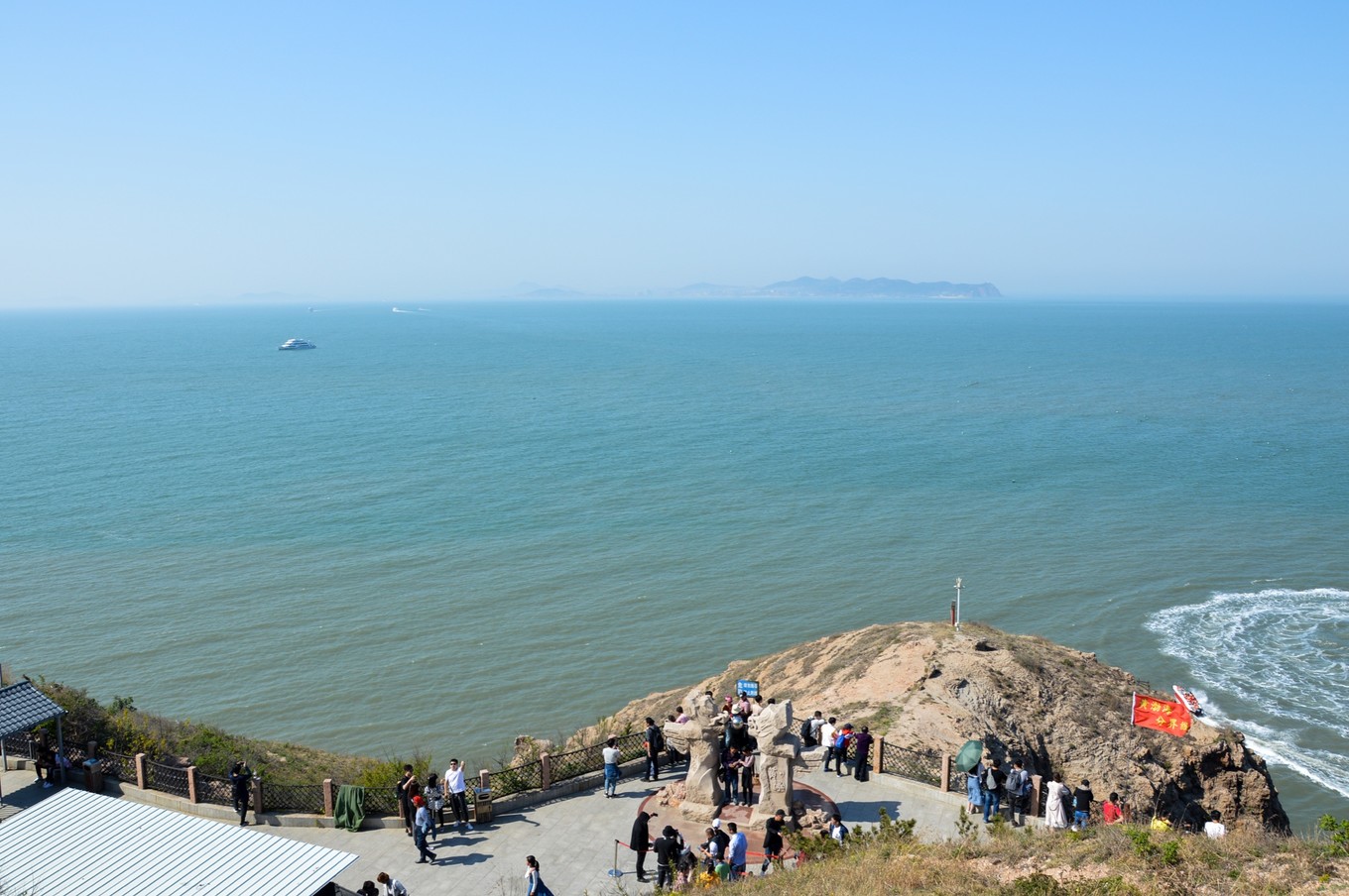 在這里能看到黃海和渤海的分界線,立了個界碑,但景區(qū)把最好的位置給占了,美其名曰免費拍照,給的是小照片,大照片要再花錢,跟之前去武隆的套路一樣。但我觀察了下,攝影師太隨意了,界碑后面站滿了人也不管,所以我沒去照,自己在背面照了下。