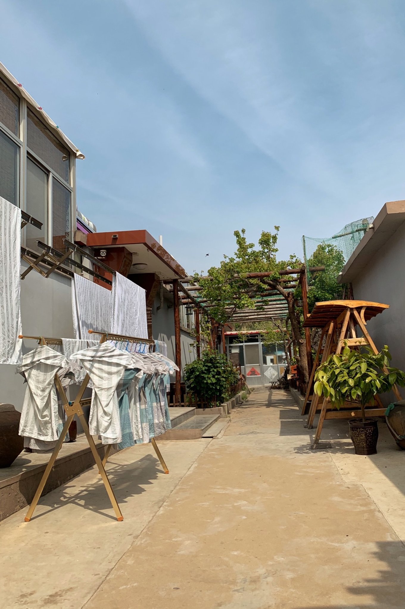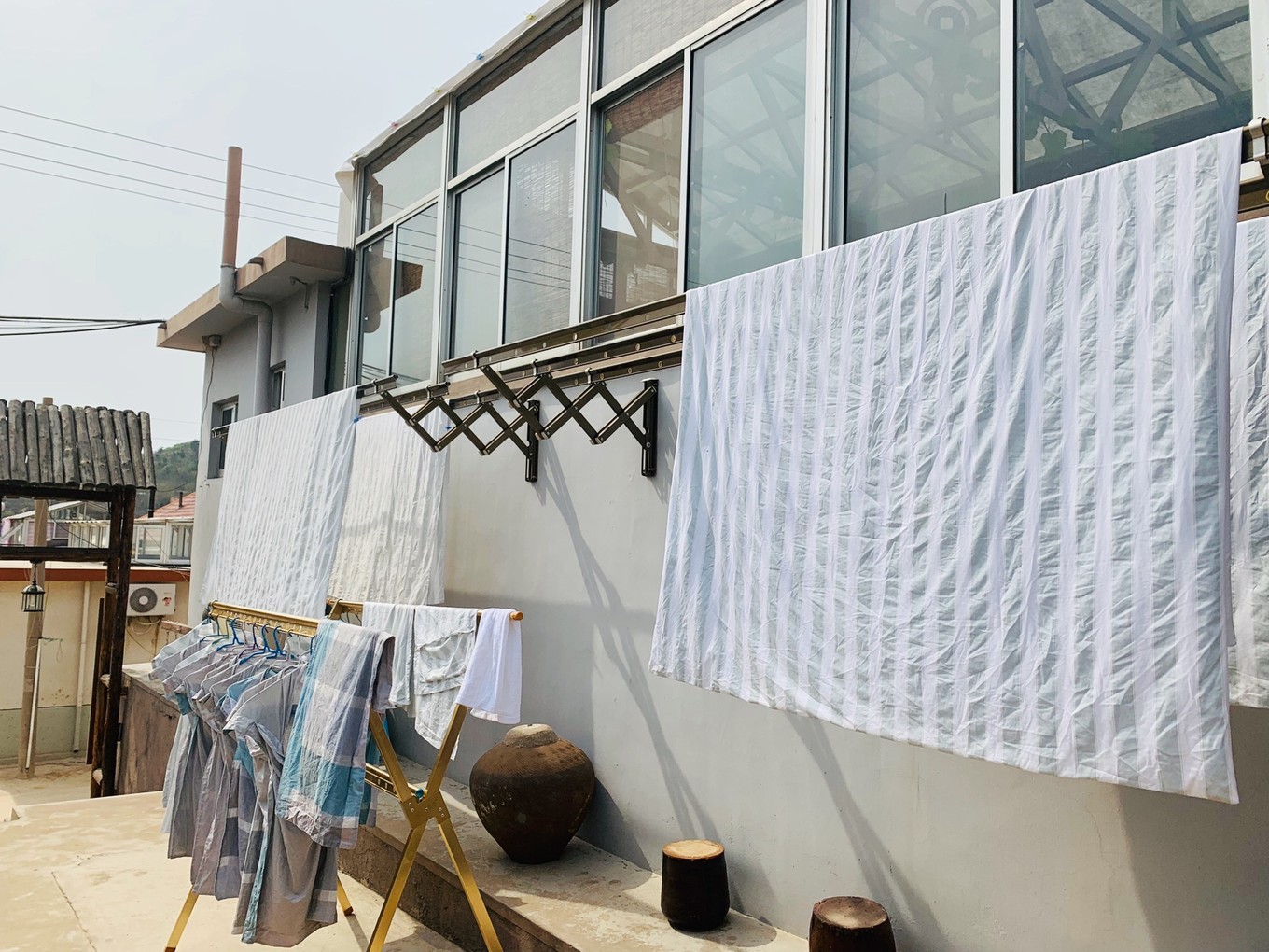 長島海上人家漁家樂每次有客人退房都能看到老板換洗床單被罩,我們是最后一個走的,大批換洗的床單曬在院子里。