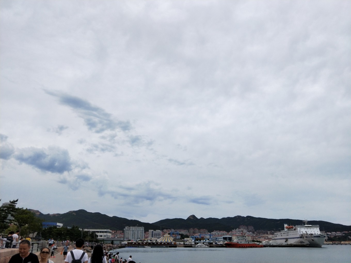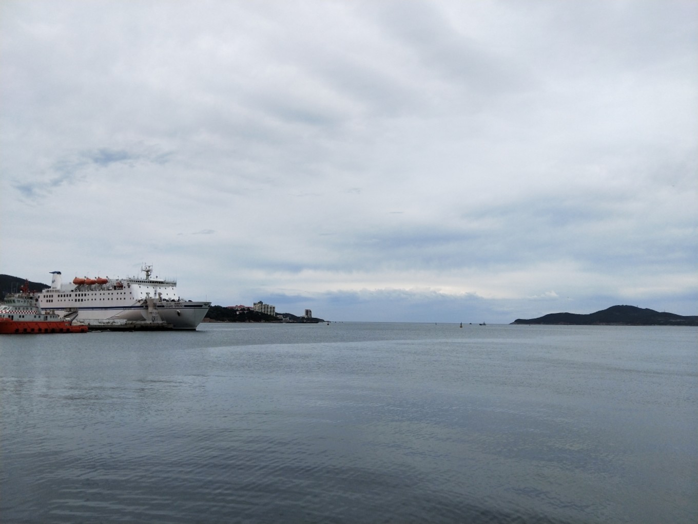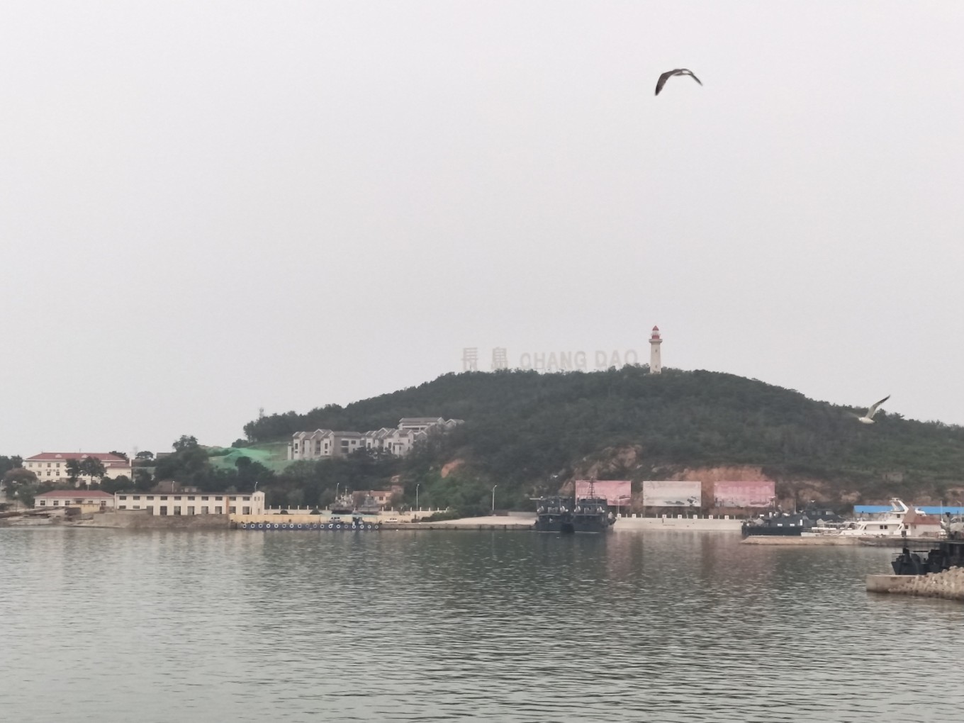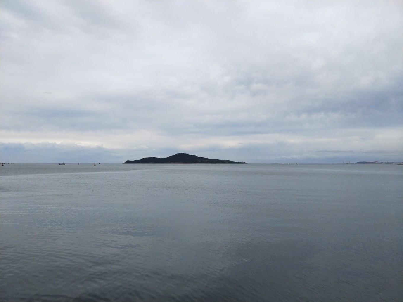 我們下午5:30到達(dá)蓬萊港,加上經(jīng)停,整整12個(gè)小時(shí)!其中有一段長(zhǎng)度200公里的高速,因?yàn)樾蘼?,變成了單車道,?dǎo)致速度慢了不少!還好,趕上了最后一班去往長(zhǎng)島的輪渡。登船時(shí),下起了零星小雨,海面上看起來(lái)霧蒙蒙的,變得更美了…當(dāng)時(shí)還在擔(dān)心,看天氣預(yù)報(bào)接下來(lái)幾天都有雨,感覺會(huì)很掃興,殊不知后來(lái)的幾天曬成狗,每天都盼下雨…