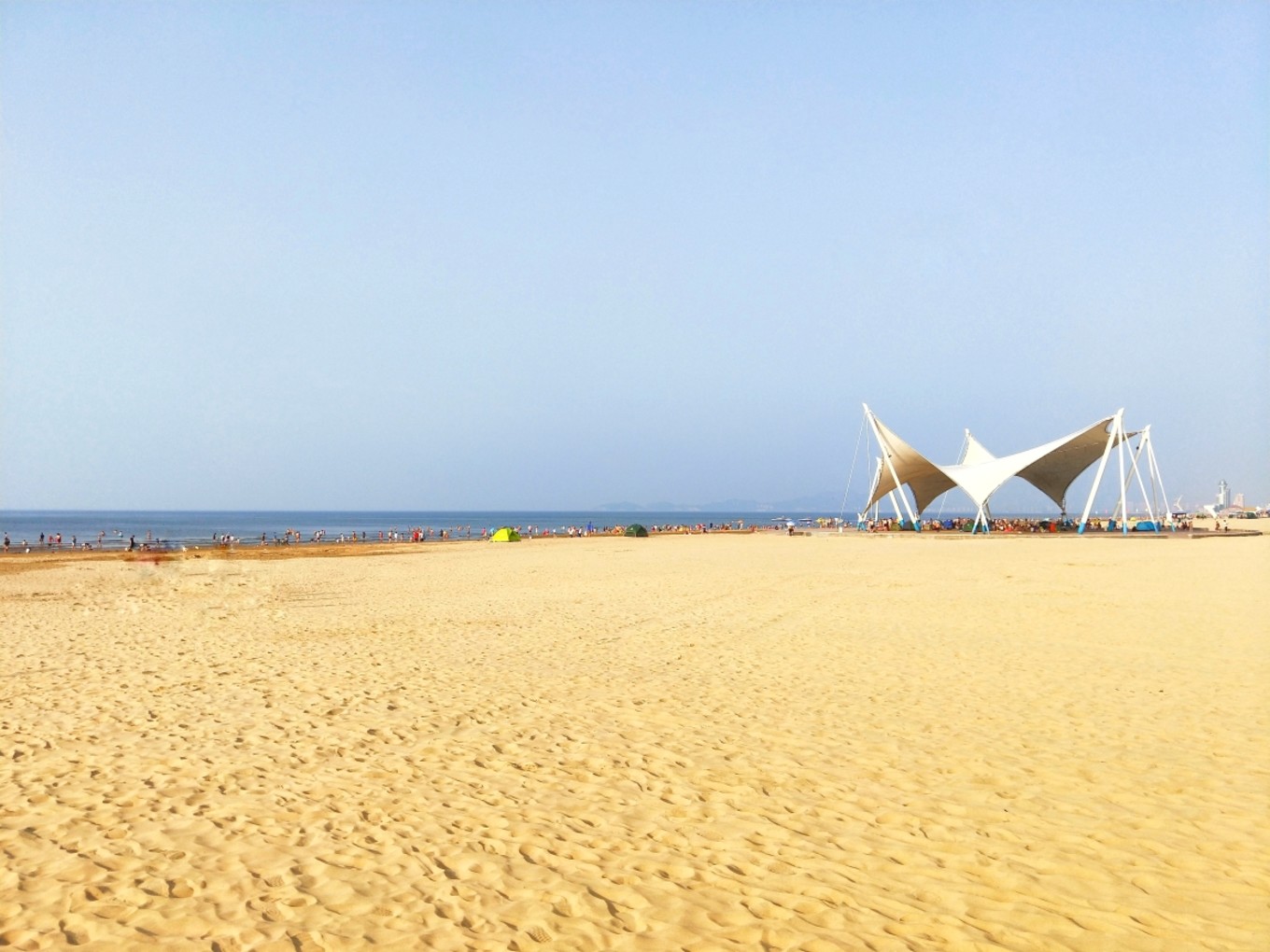 到了金沙灘,沒有了硌腳的小石頭,細(xì)軟的金色沙子腳感還是挺好的。人不是特別多,而且海水不涼,是完全可以承受的溫度。好想跳進(jìn)去游一圈…這里視野很開闊,長(zhǎng)度兩公里的海灘基本可以看到頭尾…