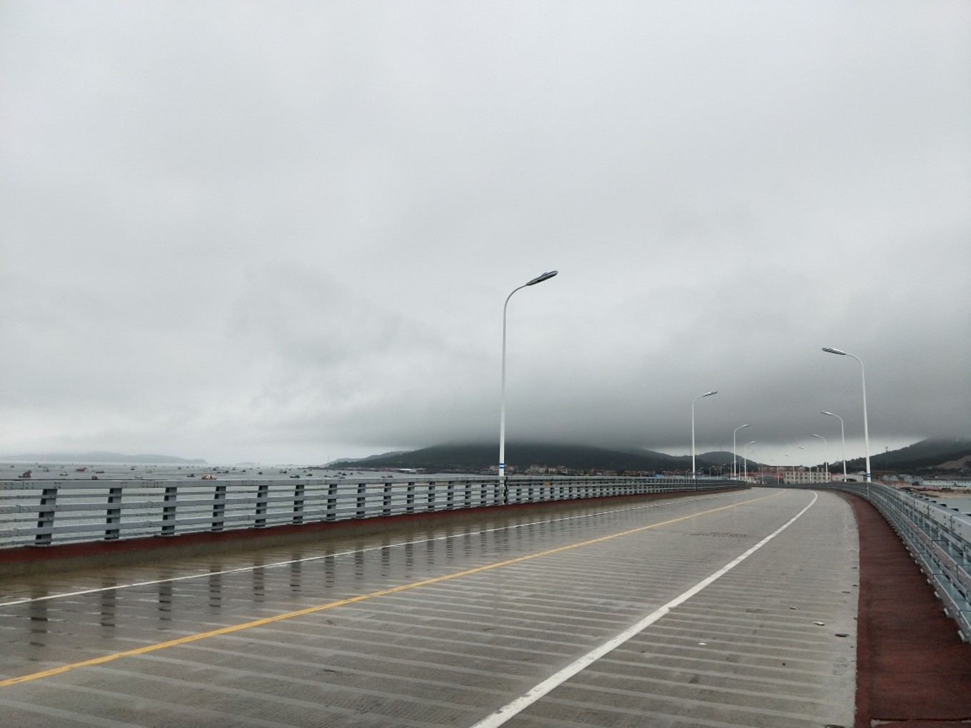 因?yàn)樵绯肯铝它c(diǎn)雨,所有的山頂都被云霧繚繞著,路過跨海大橋,覺得很美,就停下來(lái)拍了幾張。