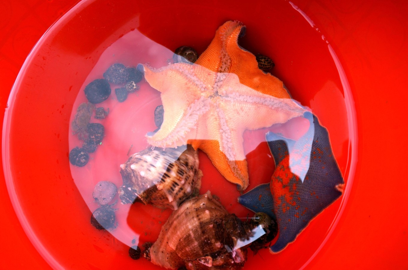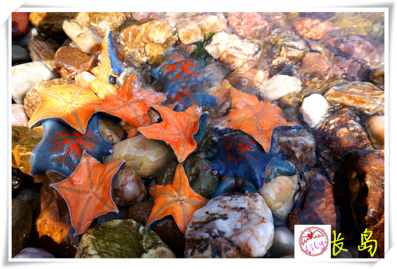 肚皮朝上的海星,嘴巴一張一張的,桔色的肚皮,看起來像一堆楓葉。很是可愛。