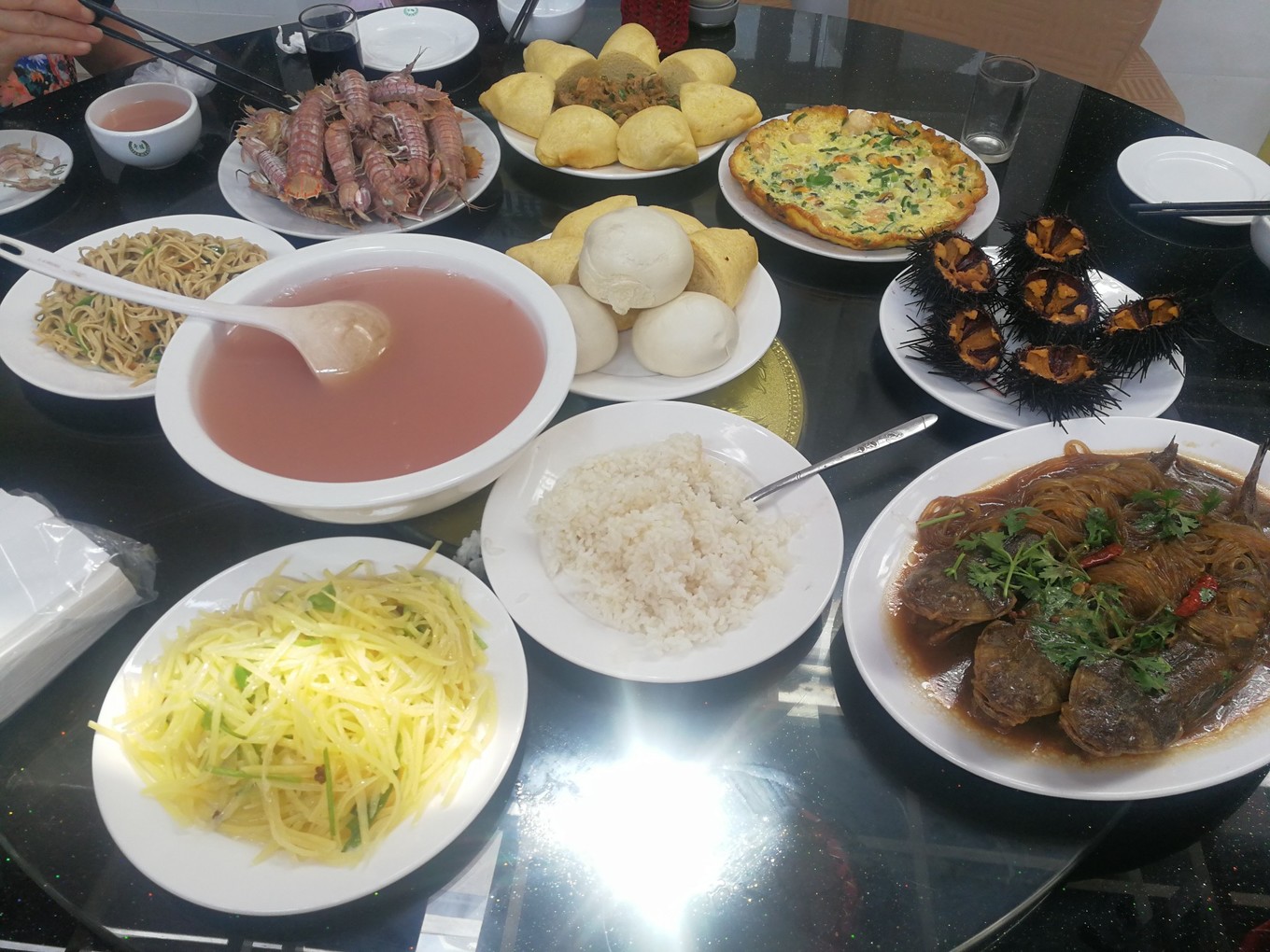 游輪到中午就結(jié)束了,豪華游輪有車接送,回到碼頭,坐免費(fèi)車回到黑石嘴村。漁家大哥又做了一桌好菜。因?yàn)橄挛缫ペs海,今天退潮的時(shí)間是1:30,要趕在這個(gè)時(shí)間去才可以撿到東西,所以1點(diǎn)就出發(fā)了。