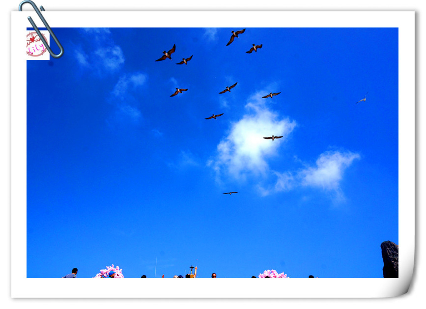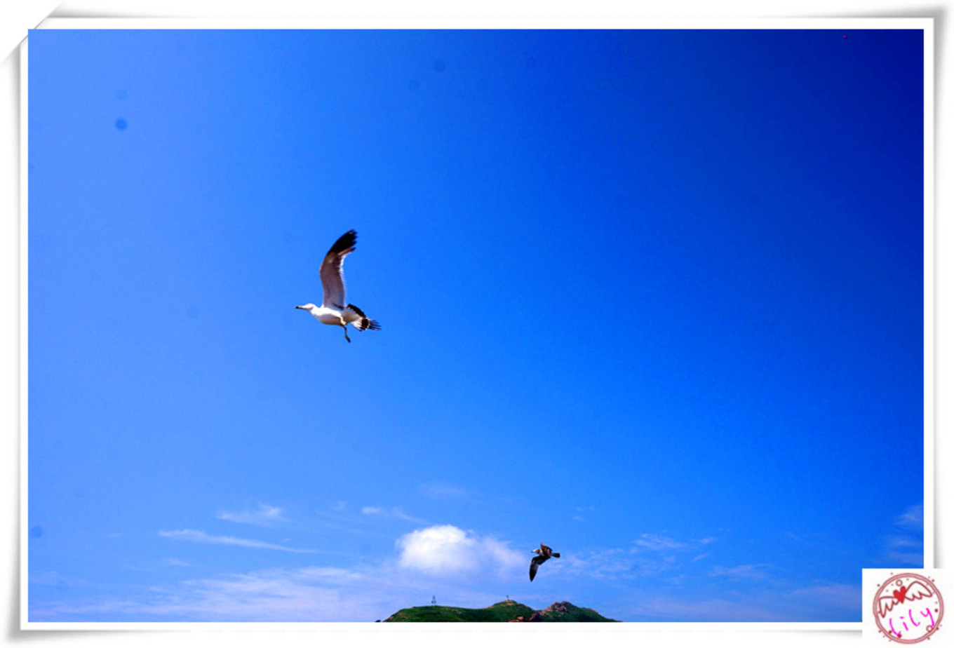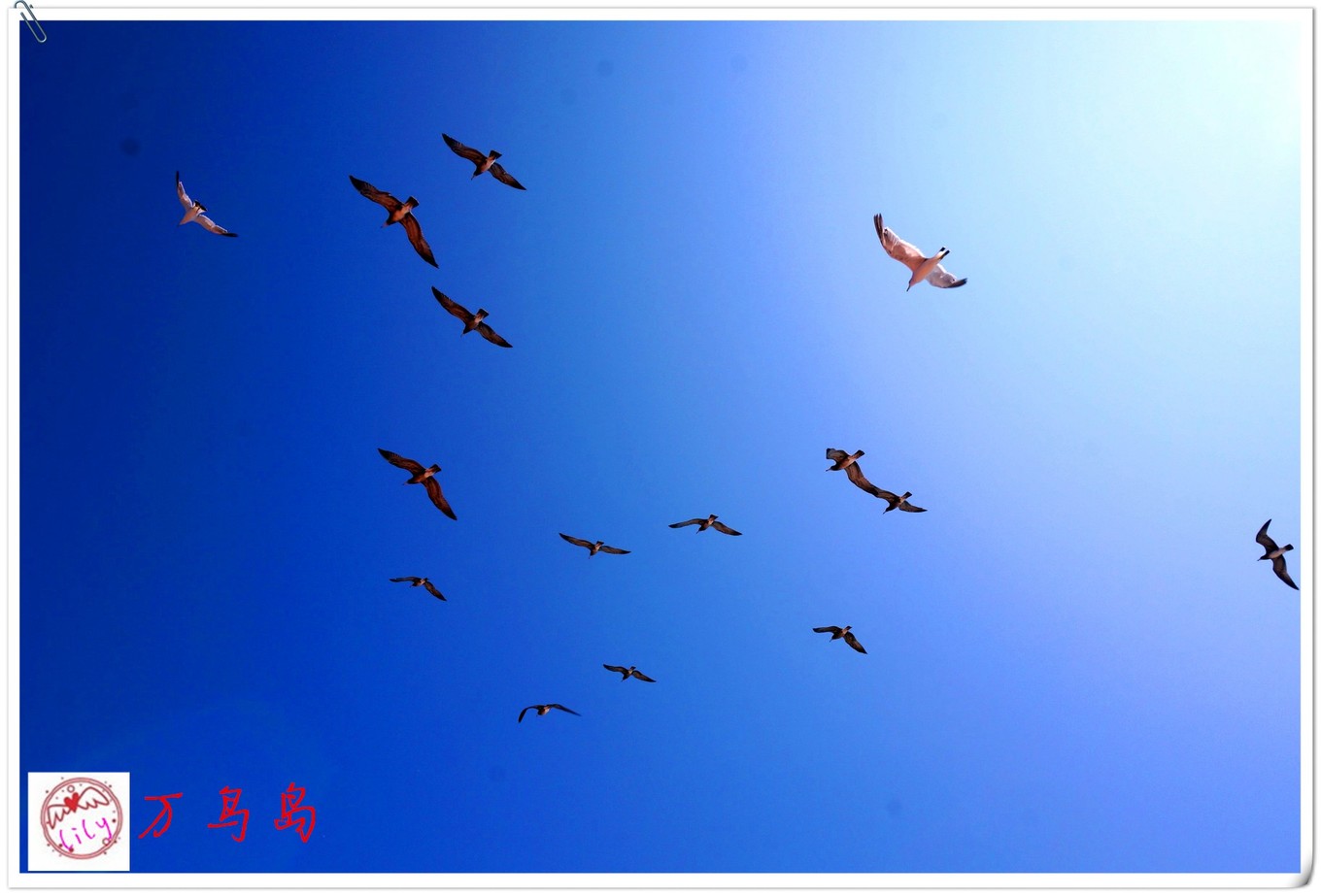 在甲板上也聽不見廣播,也不知道有沒有到萬鳥島,反正看到一些海鷗,人們都圍到甲板上開始喂海鷗,因?yàn)閿?shù)量不多,沒有領(lǐng)略到海鷗飛下來吃食的風(fēng)光,海鷗只在頭領(lǐng)盤旋,鳴叫,我們把火腿腸掰小塊,用力向天上拋,海鷗居然可以接到,太厲害了。