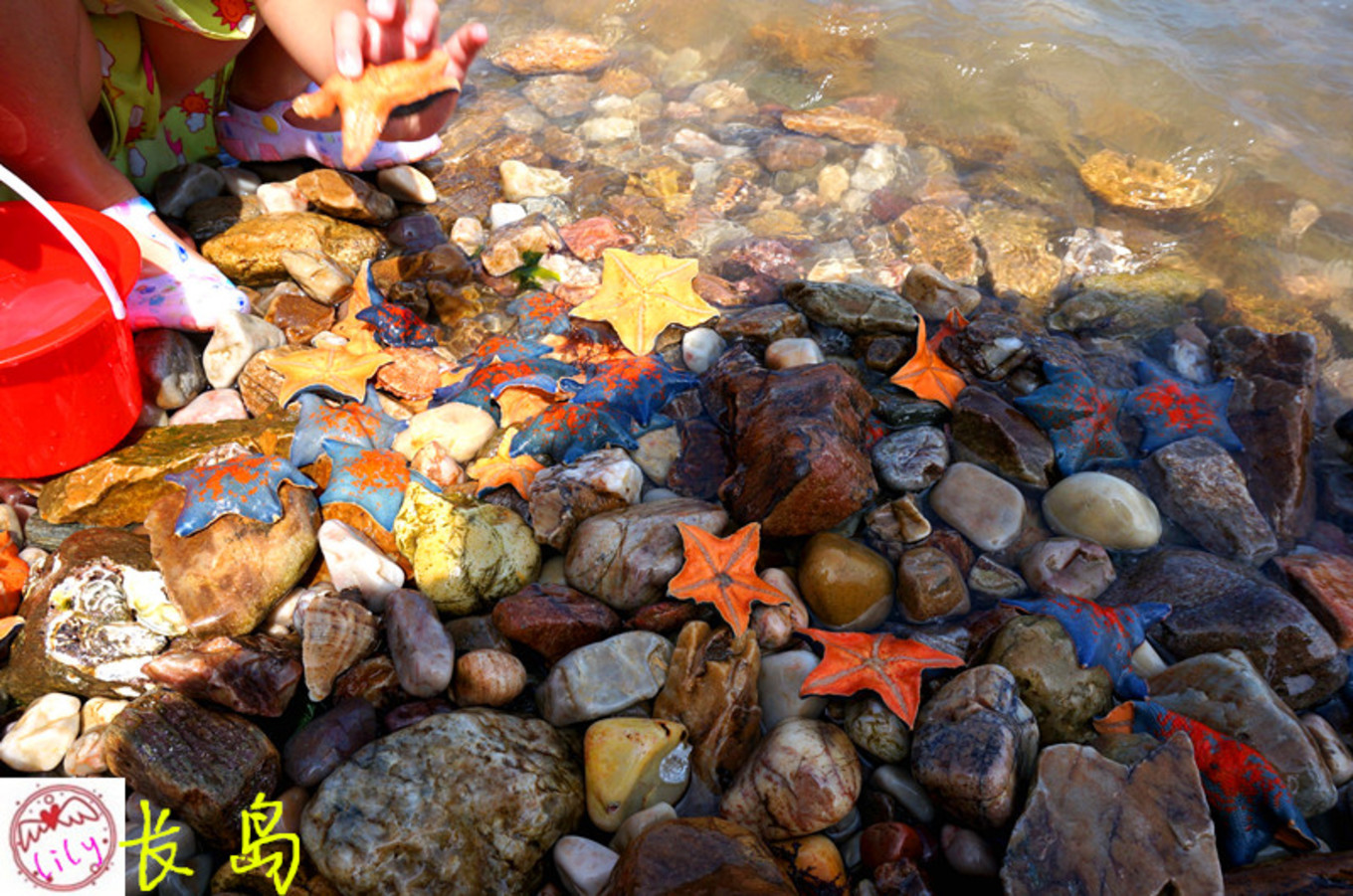 趕海最興奮的就是孩子們,這里海星很多,剛剛退下去的潮水,礁石上留下一堆海星。
