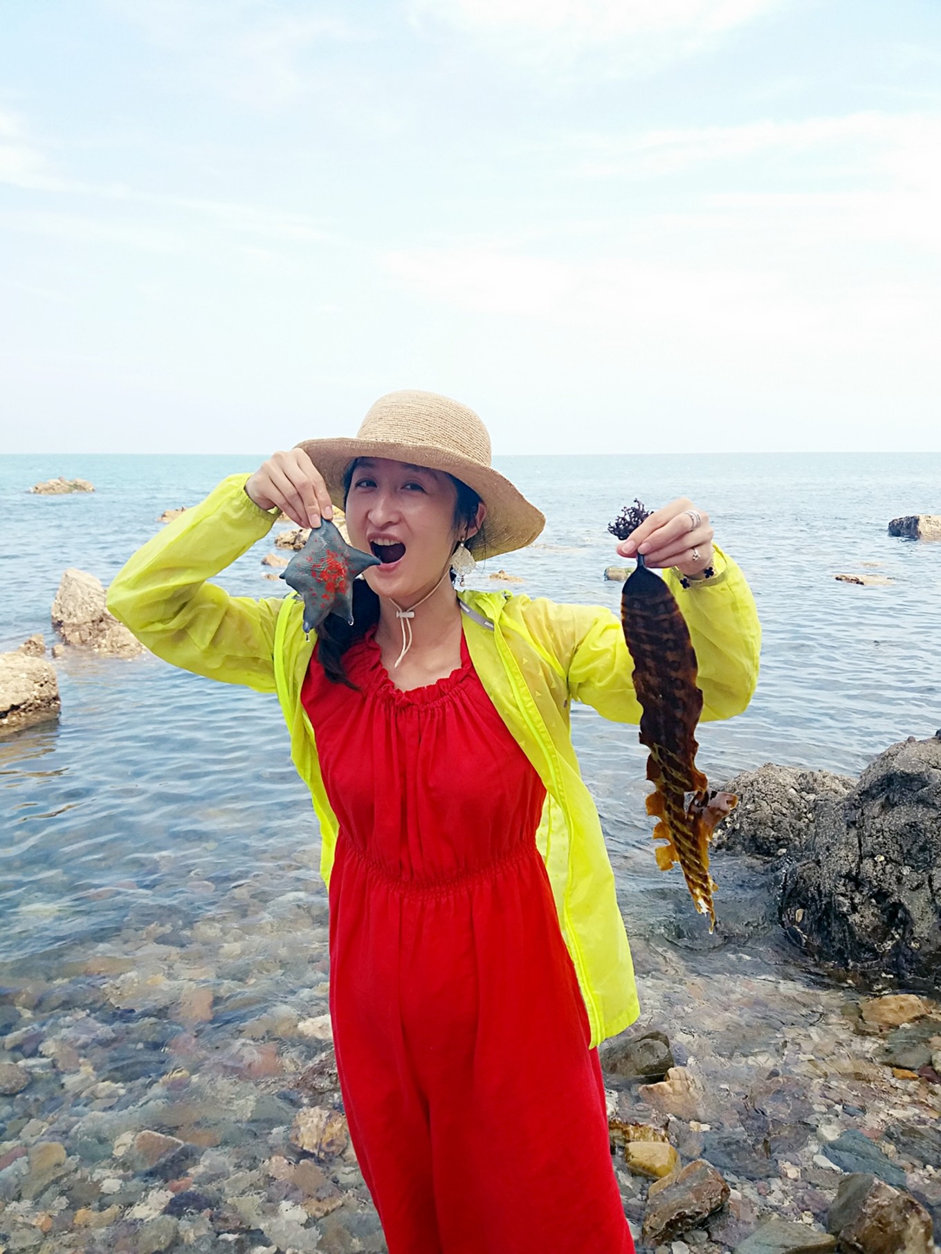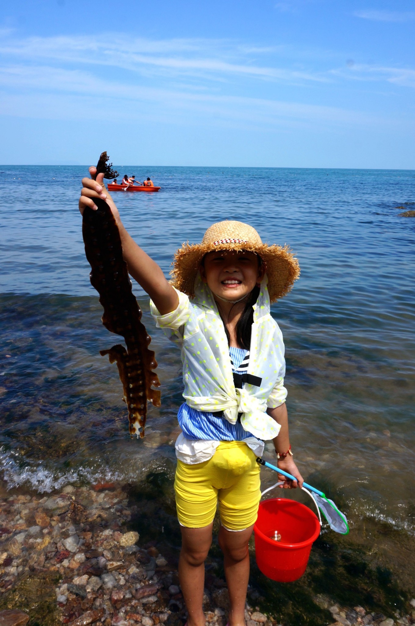 撿到海帶的孩子們也很開心,還是第一次在海邊撿到海帶。