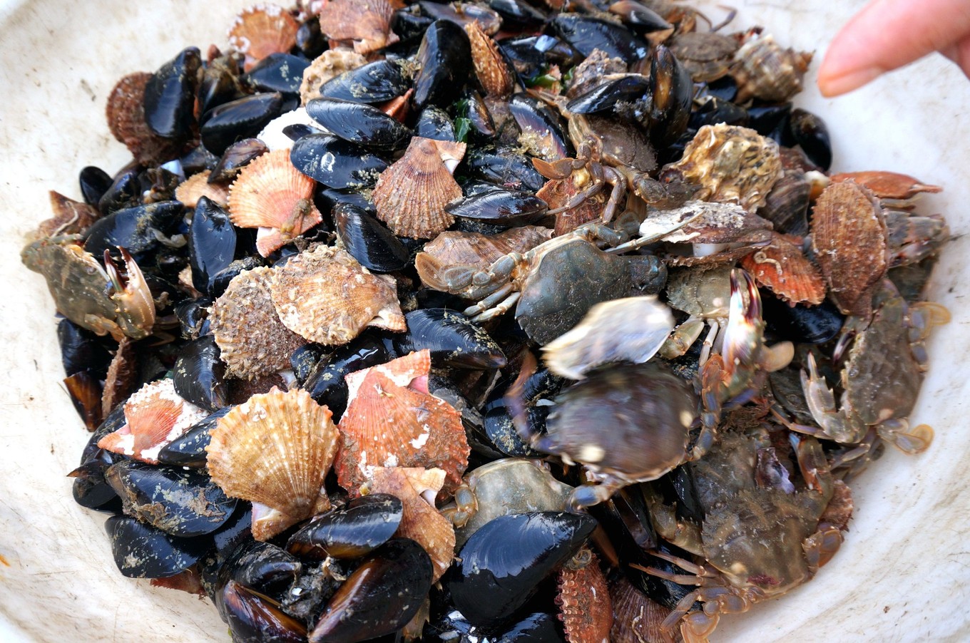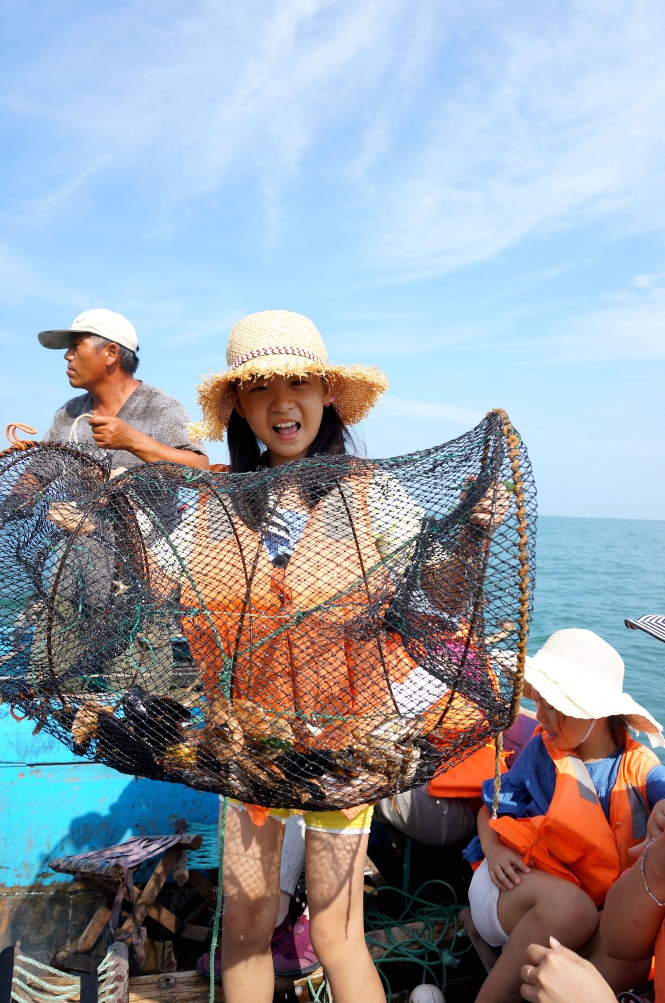 第一次出海拉蟹籠,孩子很興奮。蟹籠里沒啥值錢的東西,抓上來的梭子蟹好小一點(diǎn)點(diǎn),我們又把它放回海里了,留下一些扇貝和海虹。