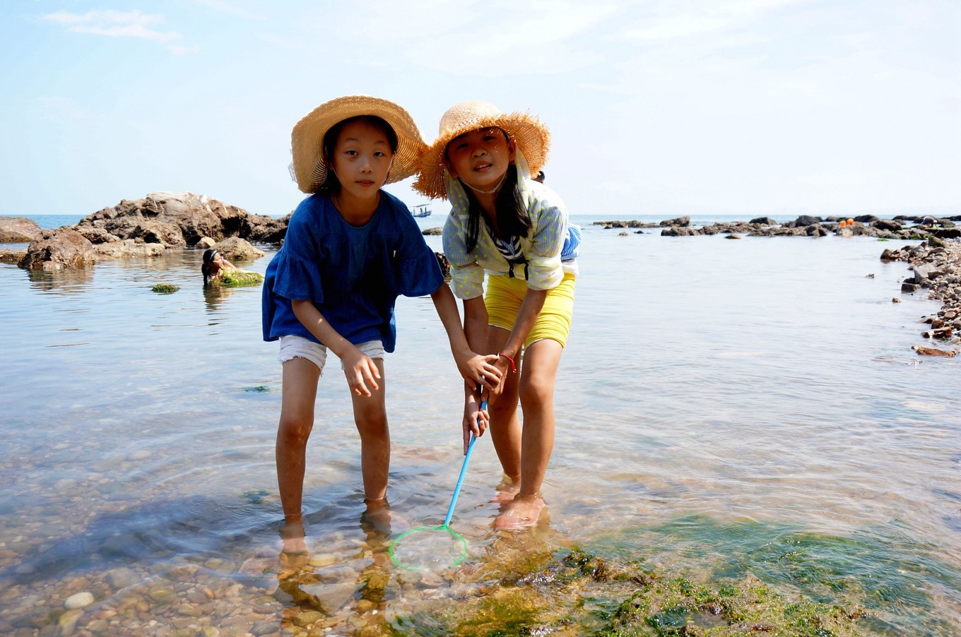 蔚藍(lán)辣眼睛的天空,一望無際,海天一色的大海,孩子們開心撿海鮮,我們安心拍照片。
