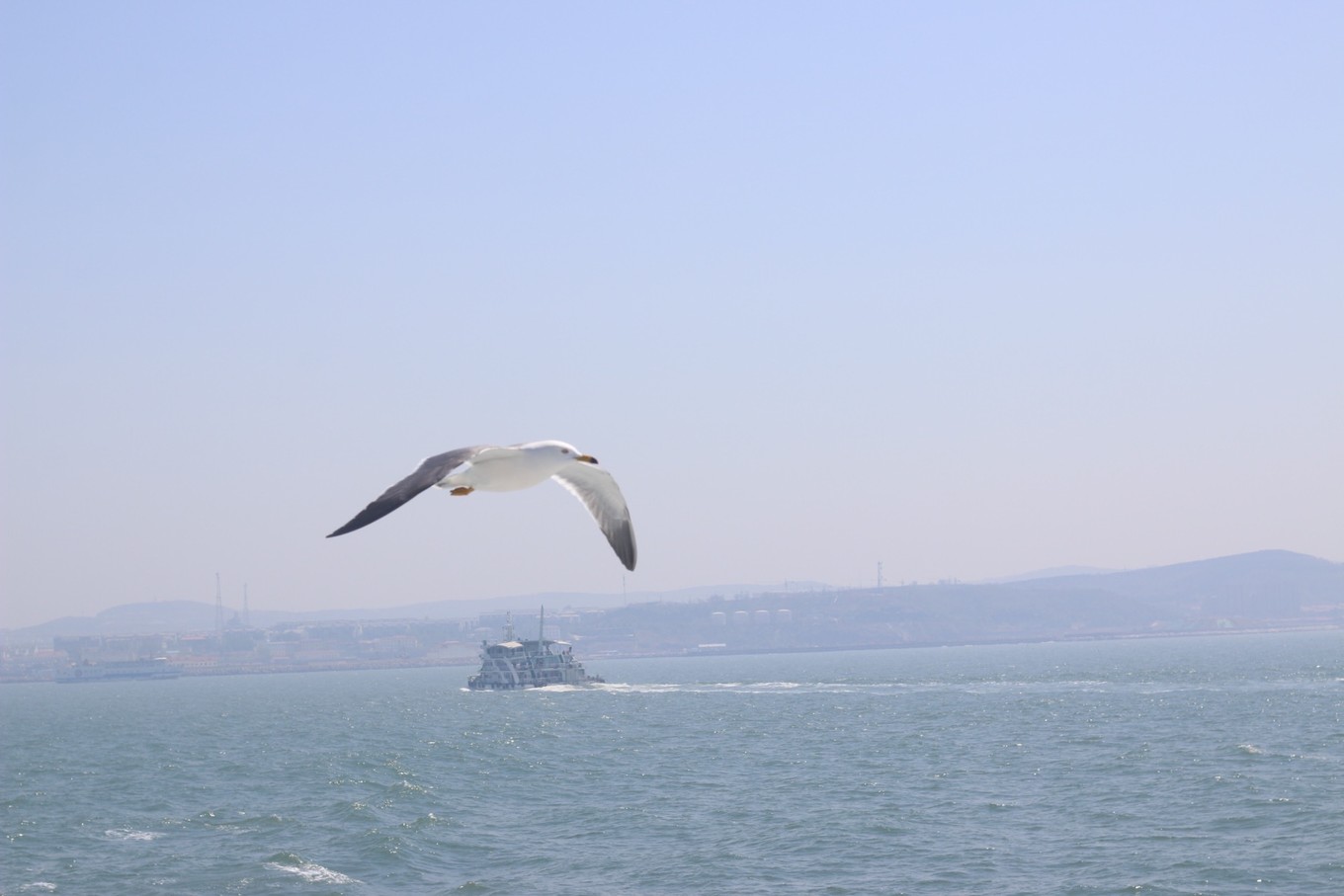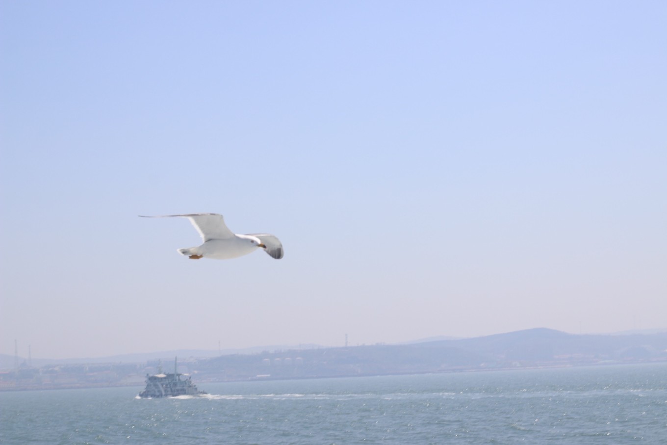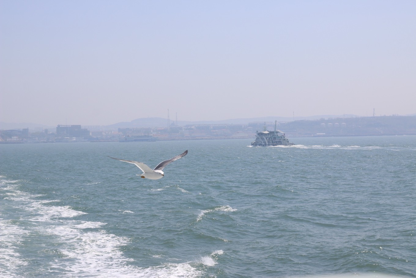 乘船 跟隨的海鷗及波濤的海面