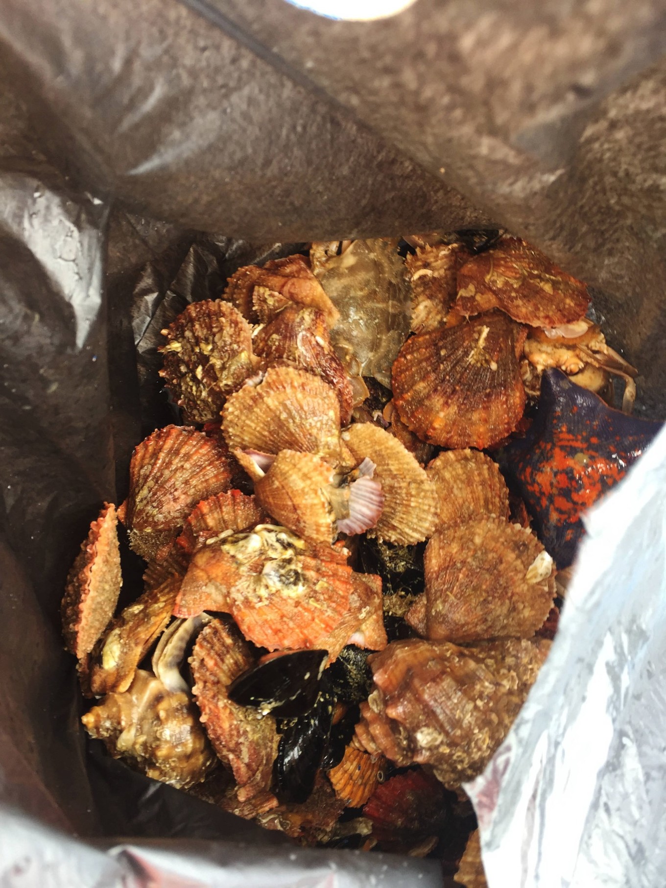 拔蟹籠。交了幾個人的錢,就會給你幾籠海鮮,工作人員會拿袋子現(xiàn)場裝好給你。岸邊有加工點(diǎn),可以選擇上岸后現(xiàn)場加工吃完走人,貌似是免費(fèi)的。我們沒有在現(xiàn)場加工,因為我們娘倆吃不完。帶回去找店家?guī)兔庸さ?,最后足足吃了兩頓。