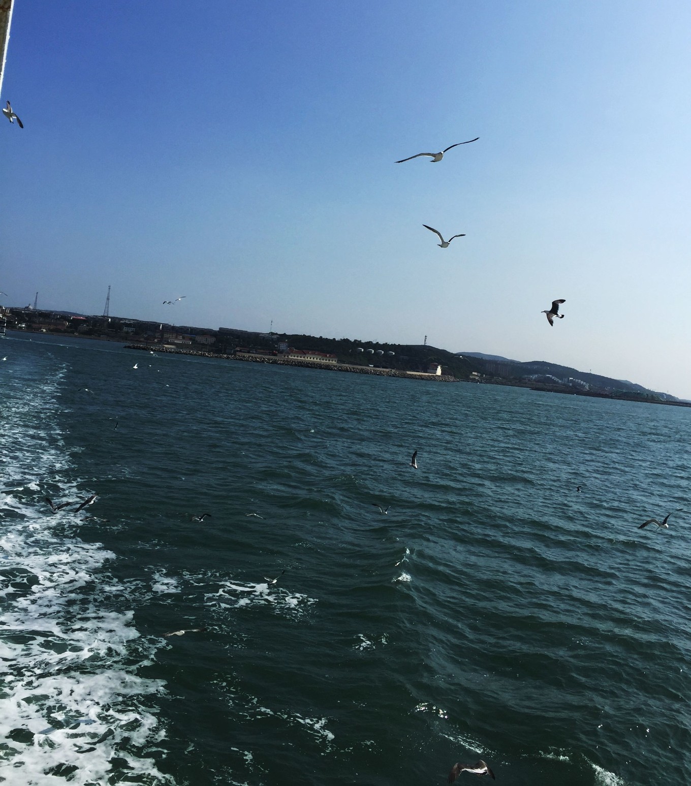長島回蓬萊的客輪上,花了30元升到VIP艙(大人20元,小孩10元。這個價格看船上人員的心情,一般要價20元/人)。需要自行準(zhǔn)備火腿腸喂海鷗,或者在船上買。記住,已經(jīng)不允許喂方便面了,因為發(fā)生過海鷗被脹死的事件。