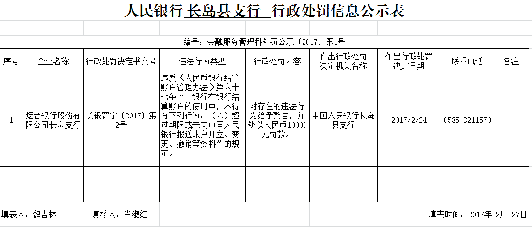 近日,中國(guó)人民銀行濟(jì)南分行發(fā)布的長(zhǎng)銀罰字〔2017〕第2號(hào)行政處罰書顯示,煙臺(tái)銀行股份有限公司長(zhǎng)島支行在經(jīng)營(yíng)過程中,違反了《人民幣銀行結(jié)算賬戶管理辦法》第六十七條“銀行在銀行結(jié)算賬戶的使用中,不得有下列行為:(六)超過期限或未向中國(guó)人民銀行報(bào)送賬戶開立、變更、撤銷等資料”的規(guī)定。中國(guó)人民銀行長(zhǎng)島縣支行決定對(duì)煙臺(tái)銀行股份有限公司長(zhǎng)島支行給予警告,并處以1萬元罰款。作出行政處罰的決定日期為2017年2月24日。