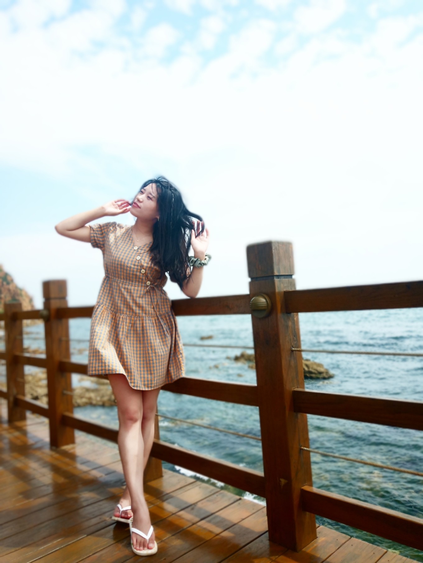 進(jìn)入臨海,沿著長(zhǎng)長(zhǎng)的棧道向前走去,一側(cè)是湛藍(lán)的海水,一側(cè)是連綿的山林,空氣中帶著清新濕潤(rùn)的味道。海風(fēng)輕柔吹過來,揚(yáng)起頭發(fā)和裙擺,靠在一側(cè)的欄桿上,仰頭,側(cè)身,隨意一拍,都會(huì)是一張好看的照片。