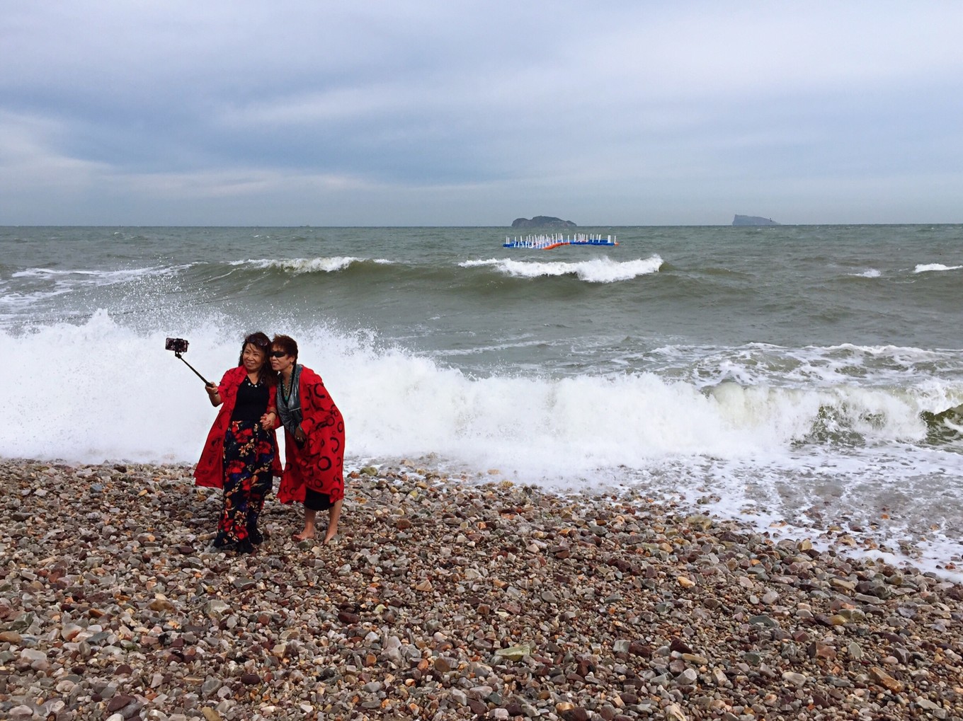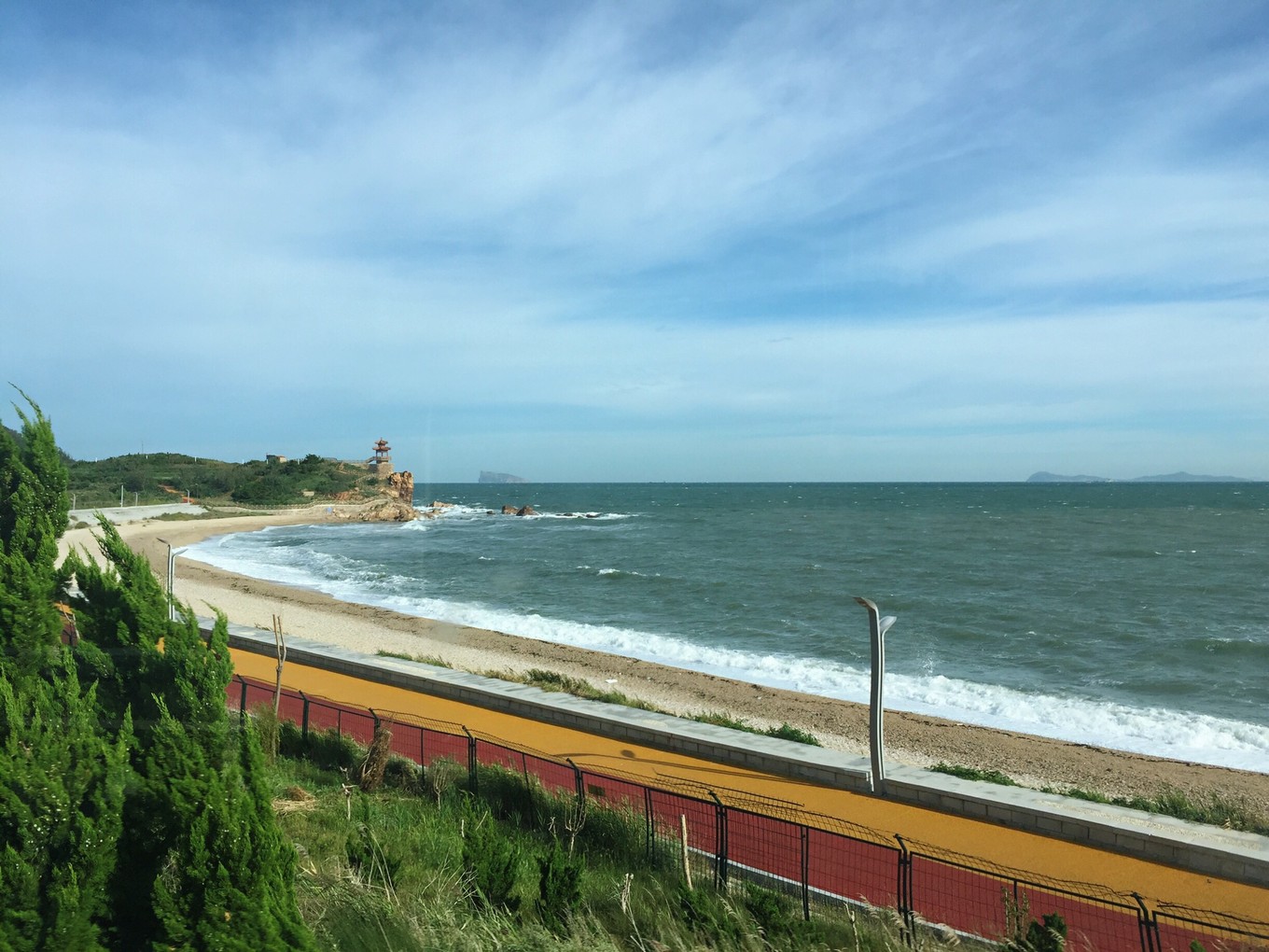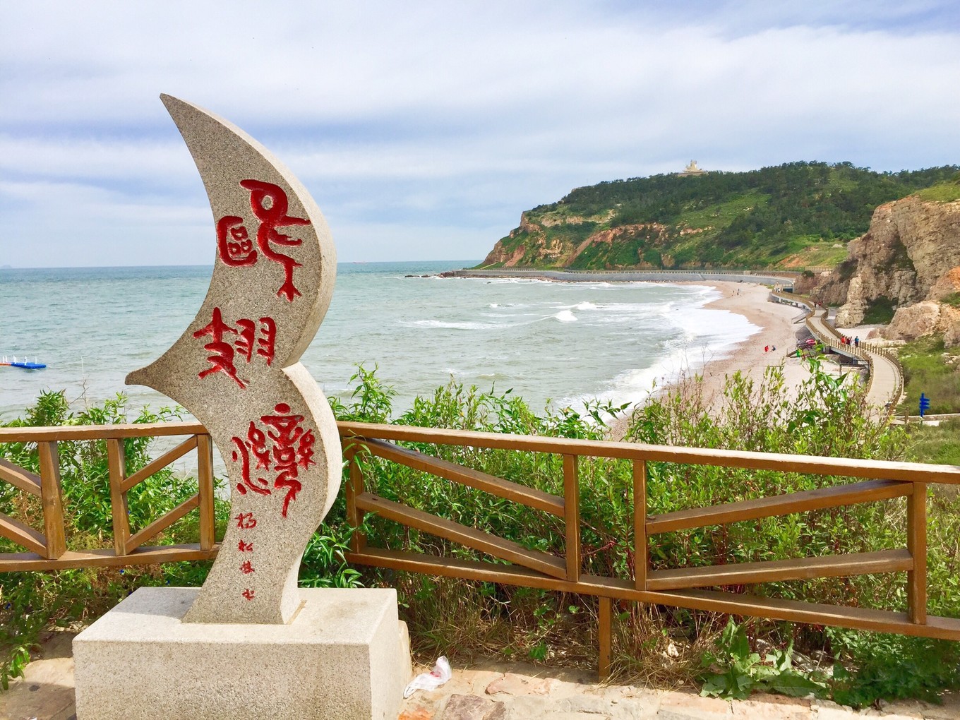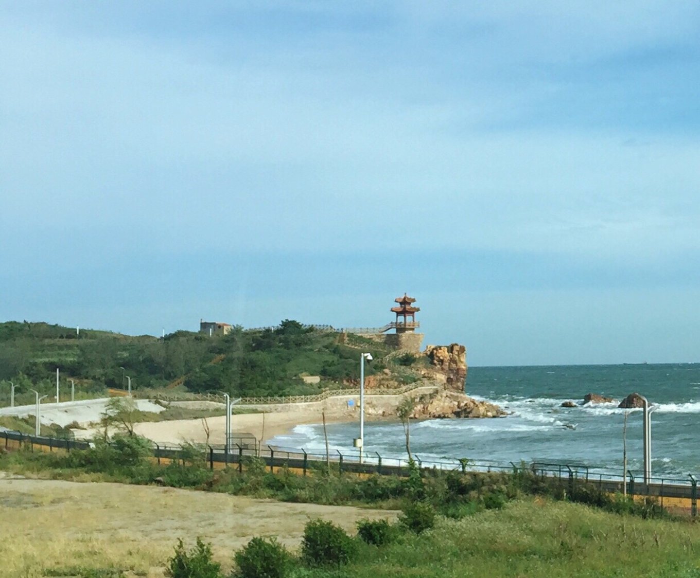 早上六點多鐘,站在山水云禾宿三樓向外看,今天天氣不錯,急忙與老板聯(lián)系問有無出海游船,答曰:因臺風玲玲影響,今天海上陣風8級,長島海上游今天繼續(xù)停航。沒有其他選擇,今天只能先游九丈崖和月牙灣,寄希望于明天的海上游能成行。