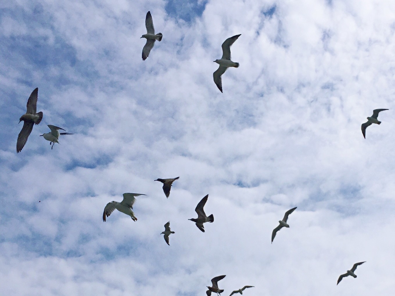 上船后為了看海鷗,花20元升艙,每人發(fā)了3根火腿腸,坐在客輪最上層。開船后,訓導員吹哨,不一會兒從四面八方飛來幾十只海鷗,游客開始向天空中拋火腿腸,海鷗們便開始爭搶。