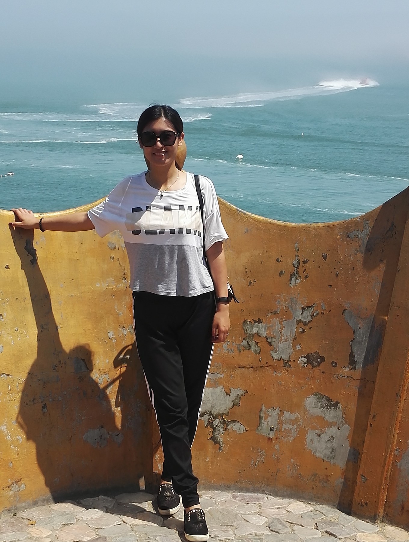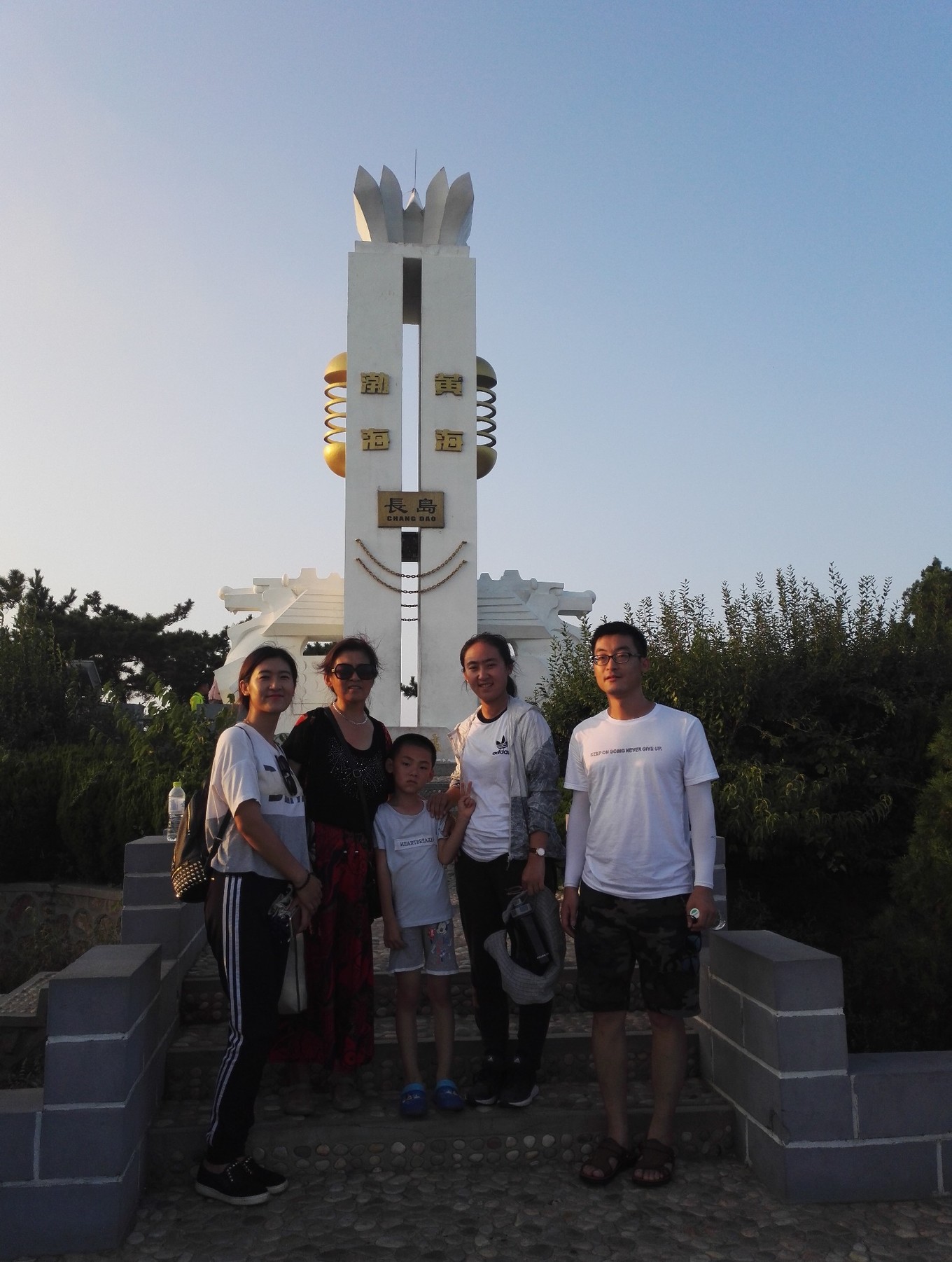 放下行李,我們先去了九丈崖,買(mǎi)了通票,成人165,60歲以上老人免費(fèi),1.2以上兒童半價(jià)。這里是一個(gè)斷崖,一邊是橫斷面的山,一邊是海,還是很漂亮的,人很多,我們?cè)诰W(wǎng)紅照相地皇冠那拍了照后,玩了一會(huì)就出去了,天氣依然很熱很熱。下一站月牙灣,其實(shí)就是一個(gè)普通的沙灘,這里的特色就是有很多透明的小石頭,很漂亮,但是現(xiàn)在喇叭里反復(fù)說(shuō)不讓撿石頭,還是有很多人在那里撿,沙灘上沒(méi)有一點(diǎn)遮陽(yáng)的地方,要中暑的感覺(jué)。沒(méi)有多待趕緊撤了。今天的最后一個(gè)景點(diǎn),林海烽山,去的時(shí)候都快關(guān)門(mén)了,挺冷清的,門(mén)口有免費(fèi)電瓶車(chē)可以拉到各個(gè)景點(diǎn),有好幾站,山上還有個(gè)鳥(niǎo)類(lèi)博物館,養(yǎng)的孔雀,沒(méi)什么意思,黃渤海分界線就是在山上,還有個(gè)架在海上的棧道,走在上面海風(fēng)吹著,還挺愜意,夜幕快降臨的大海看起來(lái)有點(diǎn)恐怖,走了一會(huì)看見(jiàn)礁石上有很多人撿貝殼和小螃蟹,我們問(wèn)了一下馬上就是最后一班電瓶車(chē)了,一切都剛剛好,到了一個(gè)新建的廣場(chǎng),有幾家飯店還開(kāi)門(mén),我們看了一下沒(méi)有想吃的,準(zhǔn)備到碼頭附近找吃的,這時(shí)廣場(chǎng)上露天放映電影,我們坐在馬扎上看了一會(huì)都餓了,就出發(fā)找吃的啦。開(kāi)車(chē)到碼頭也就十來(lái)分鐘,周?chē)芏酂镜辏S便找了一家吃的面,就回到公寓。