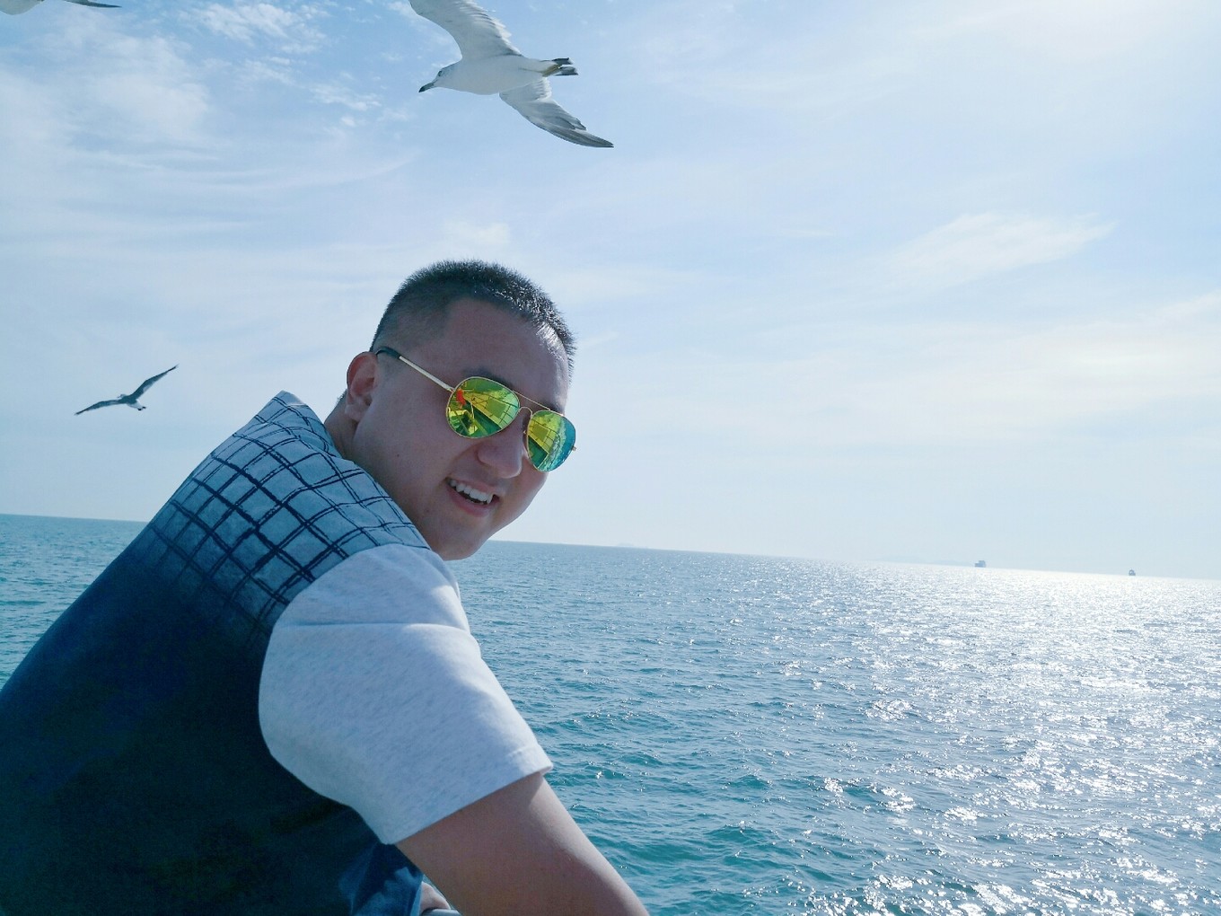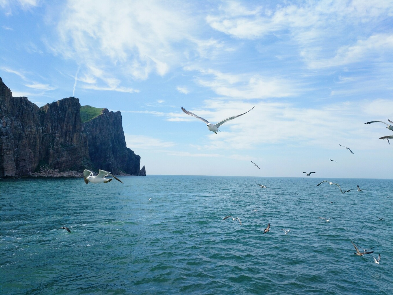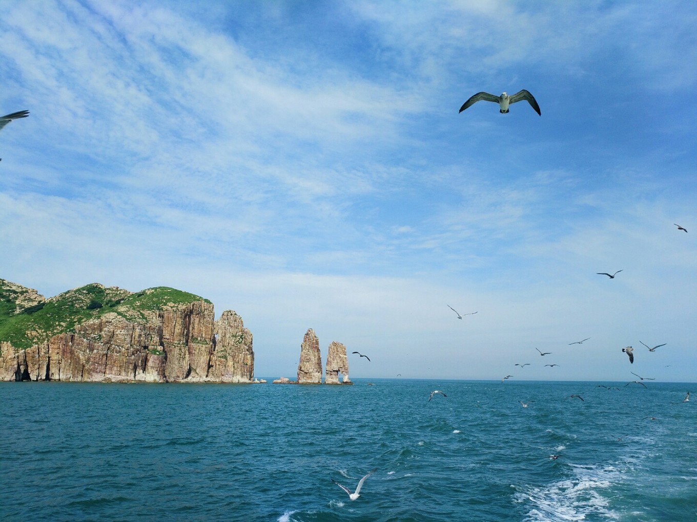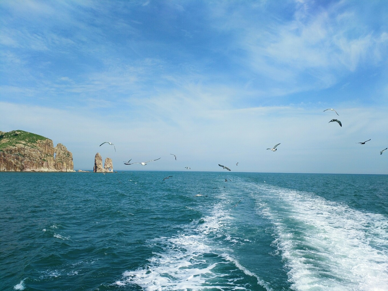 起航?jīng)]過多久就有成群結(jié)隊(duì)的海鷗跟著船盤旋了,等待著游客們的投喂,我們也帶了一包火腿腸,撕開后向天上拋出去,海鷗們一接一個(gè)準(zhǔn)兒,把火腿腸拿在手中伸向天空,一不留神就會被膽大的海鷗們叼走。