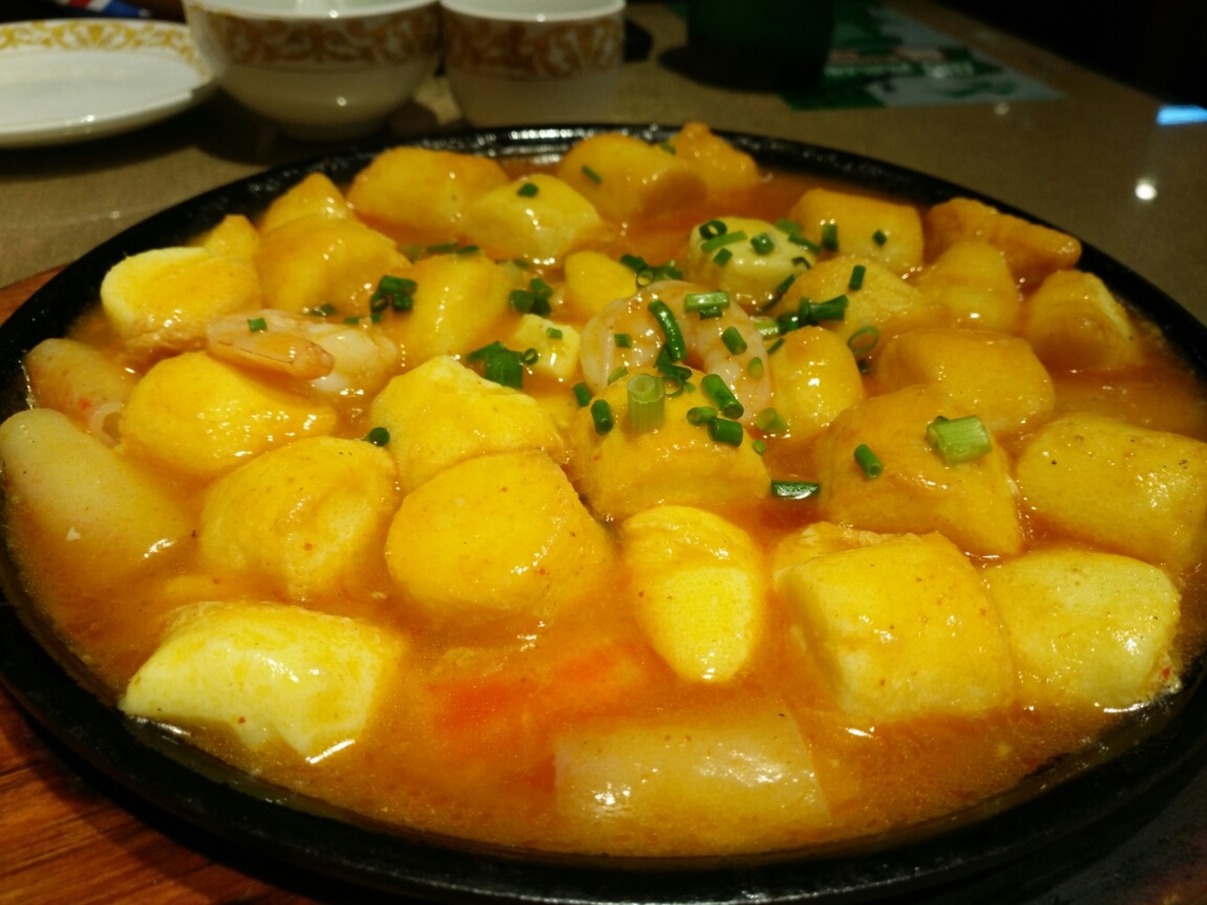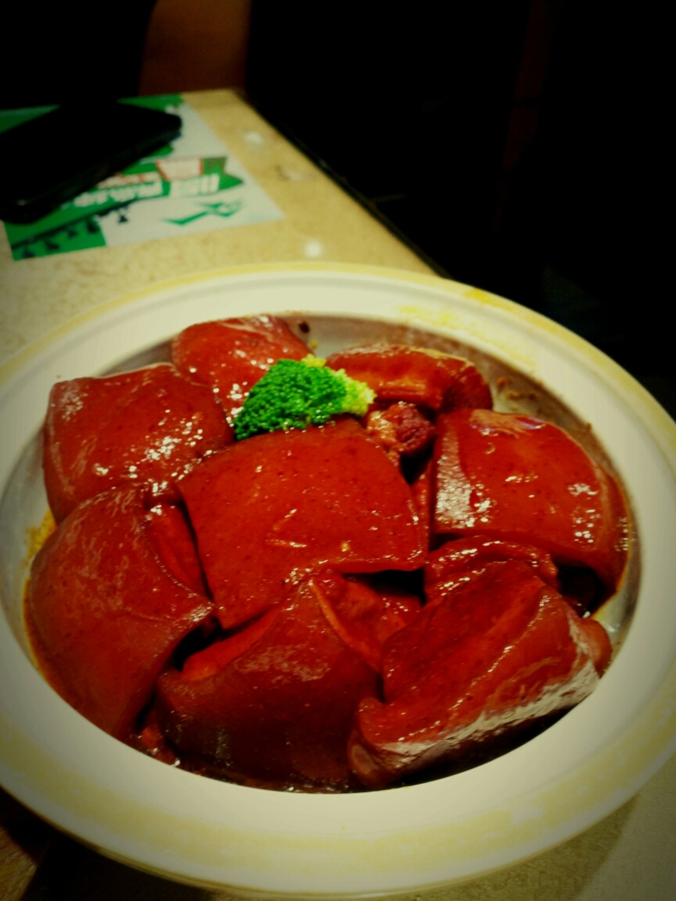 晚上在酒店旁邊的毛家飯店吃的晚飯,在進(jìn)飯店的門口正好有一個(gè)賣山東煎餅的,就買來嘗了嘗,餅子和以前的吃的比起來要更脆一些,其他差不多。進(jìn)飯店點(diǎn)了招牌的毛家紅燒肉,紅燒肉每一塊的邊長可能有4~5cm左右,感覺吃一塊就夠了