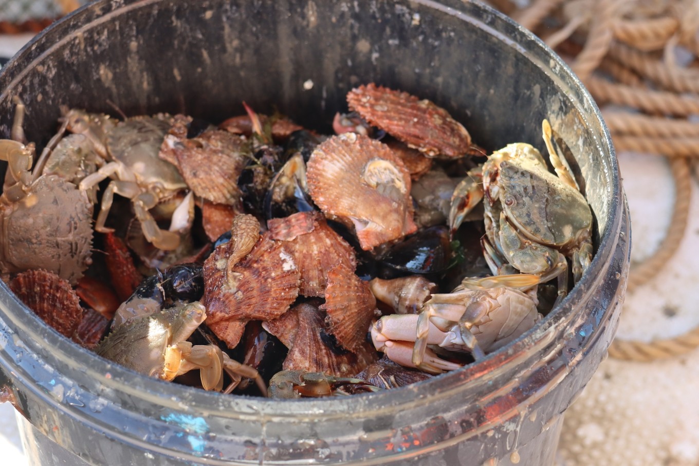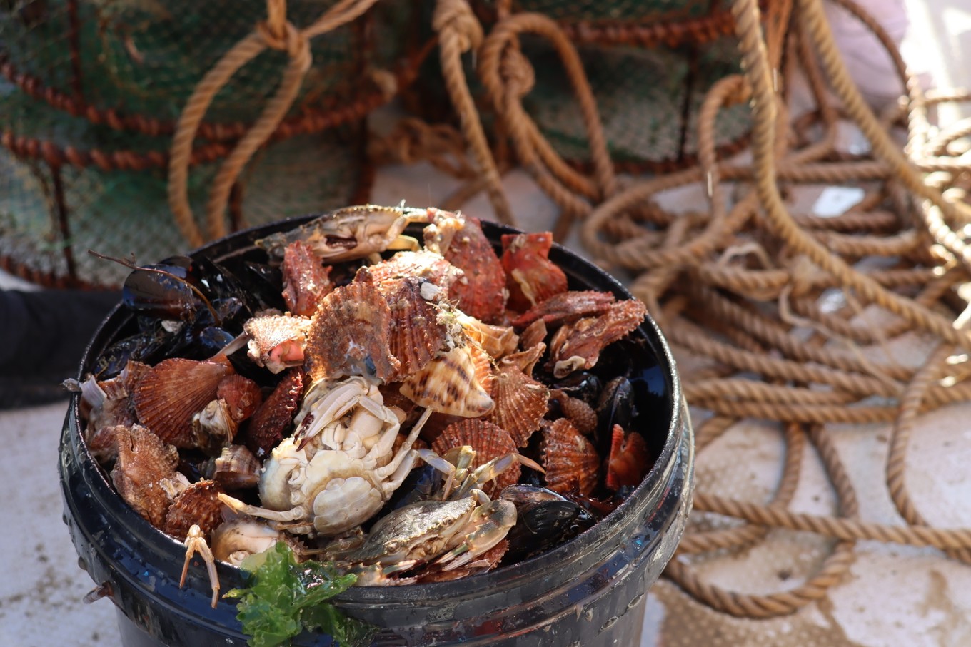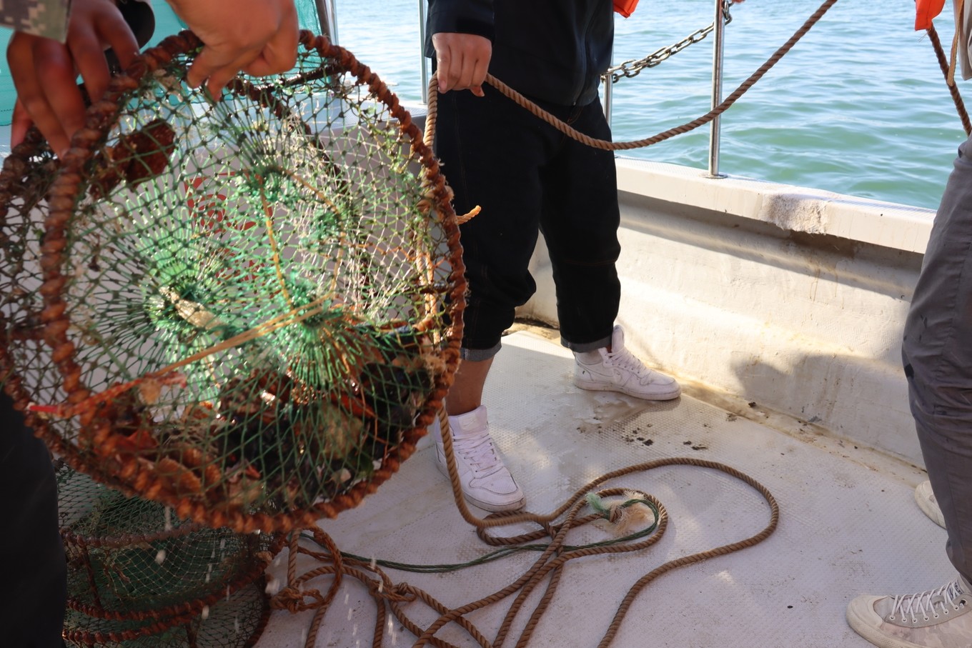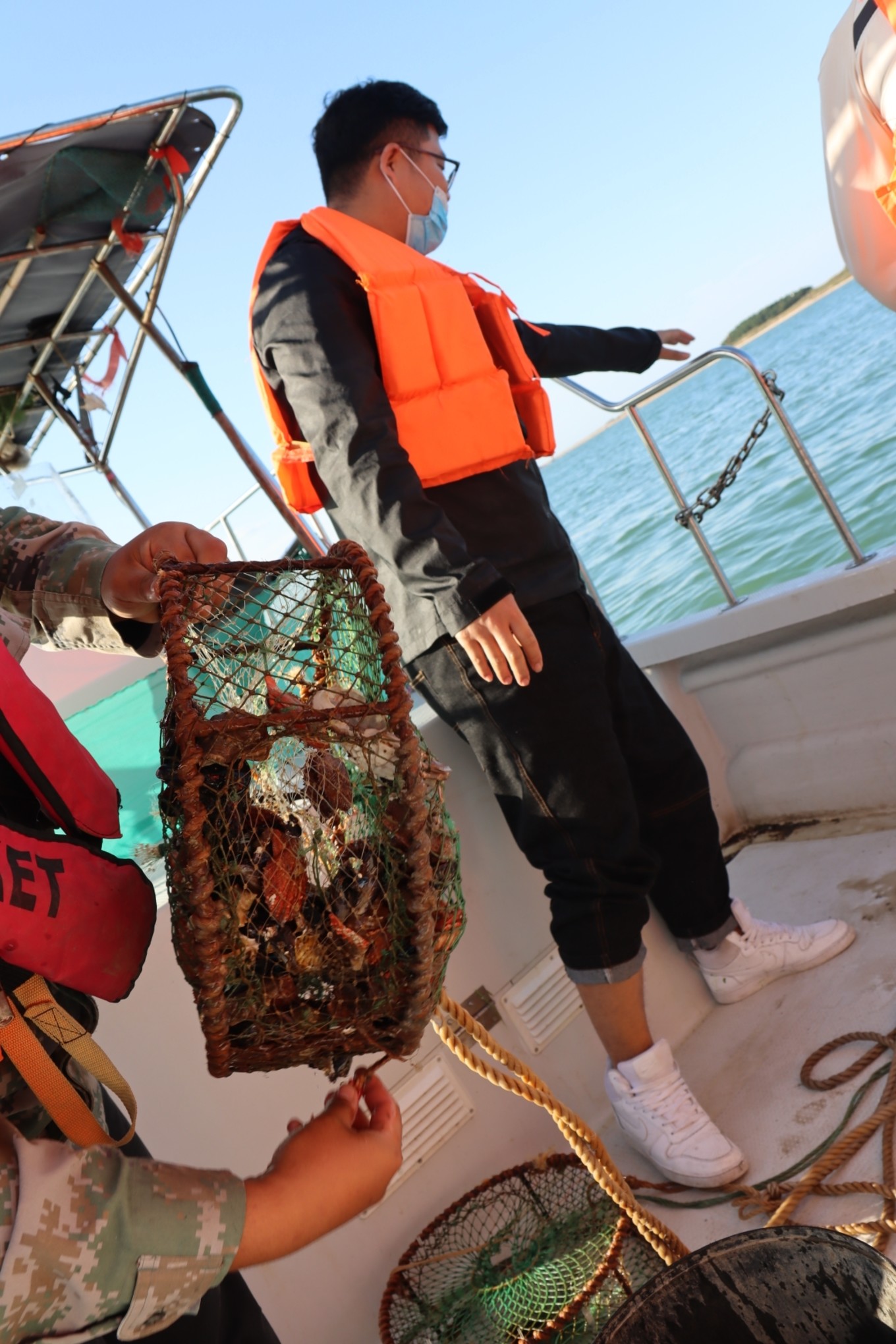 坐船前往釣魚(yú)島途中,每個(gè)人會(huì)分到一個(gè)筐子,里面有很多海鮮,看著很喜人
