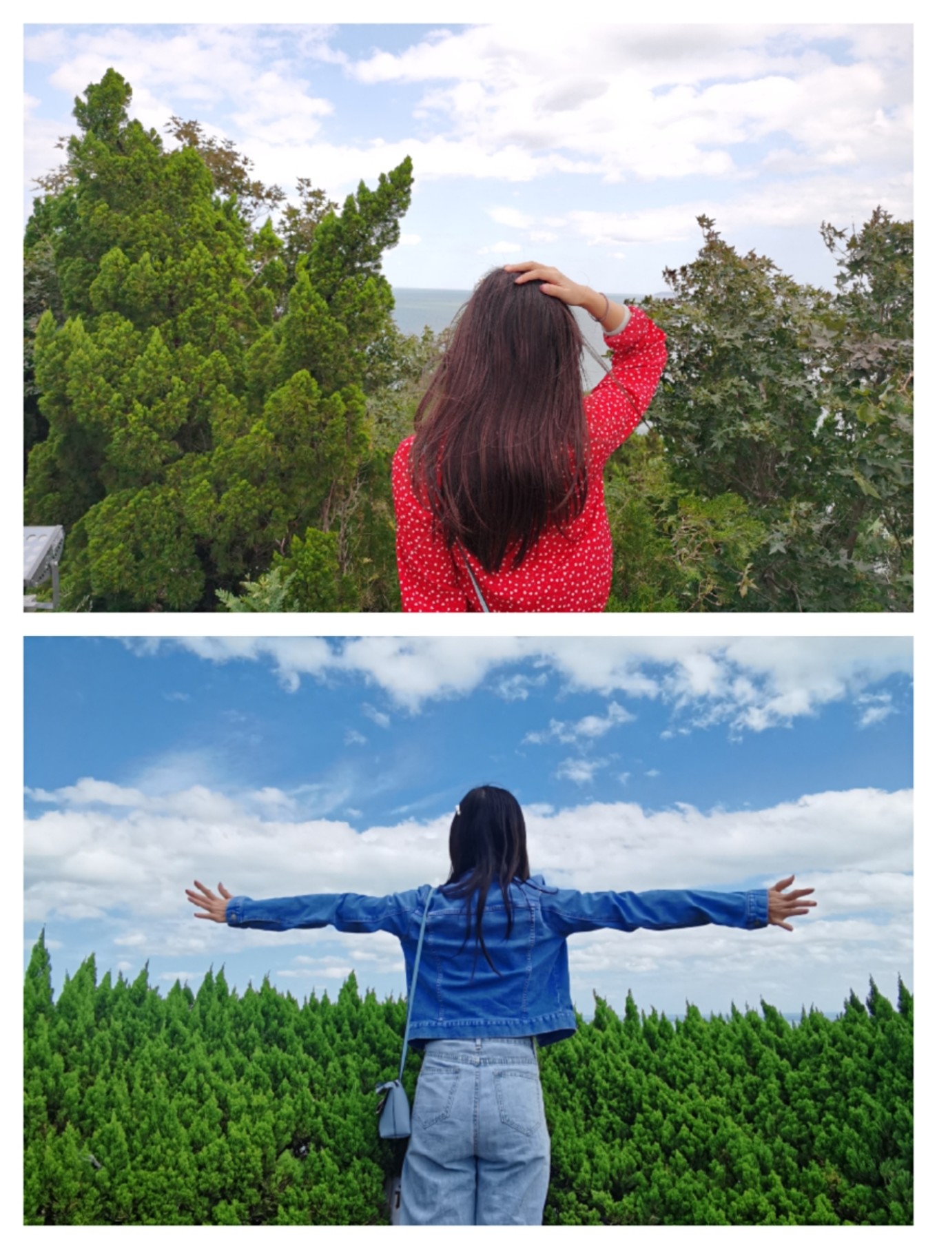 第二天早上睡起來磨蹭出門,島上果然起了風(fēng),游客服裝開始五花八門,在烽山林海拍照的時(shí)候?yàn)榱撕每矗ба烂摿伺W型馓?,穿著雪紡襯衫拍了兩張,拍完一扭頭,旁邊穿著羽絨服的阿姨看著我們眼睛里是滿滿的欲言又止