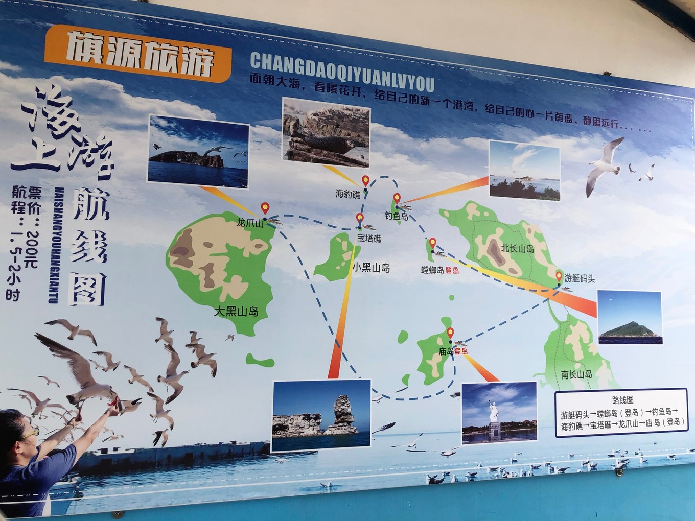 這是游覽線路圖,大約會路過7、8個小島,但只有螳螂島和廟島能登島,其它均不讓登。海豹礁也沒有看到海豹。。。