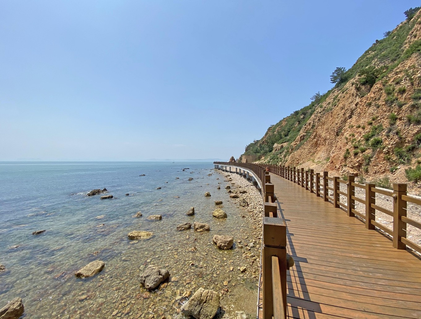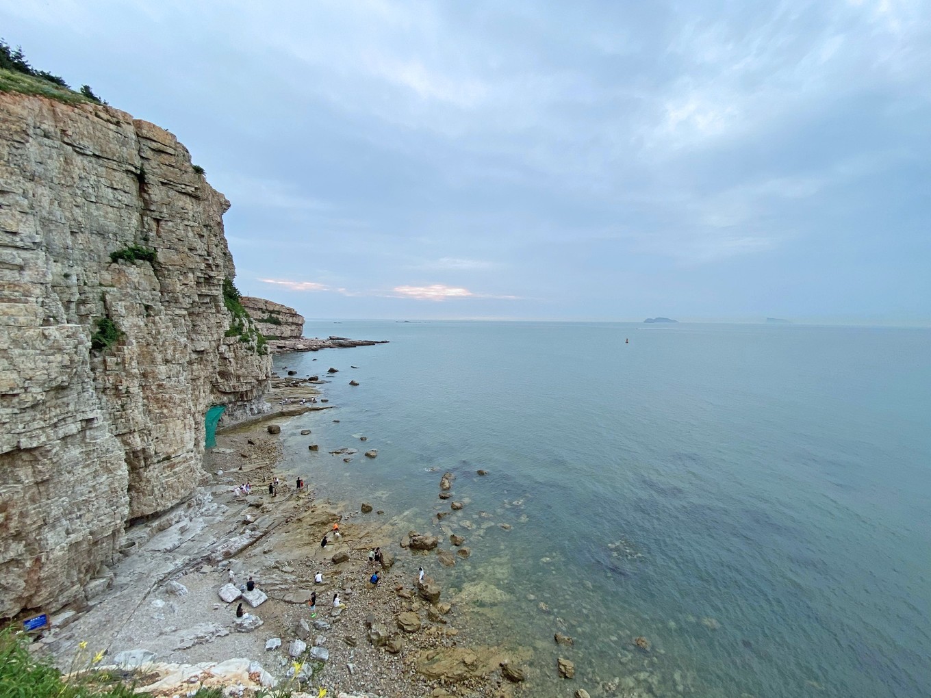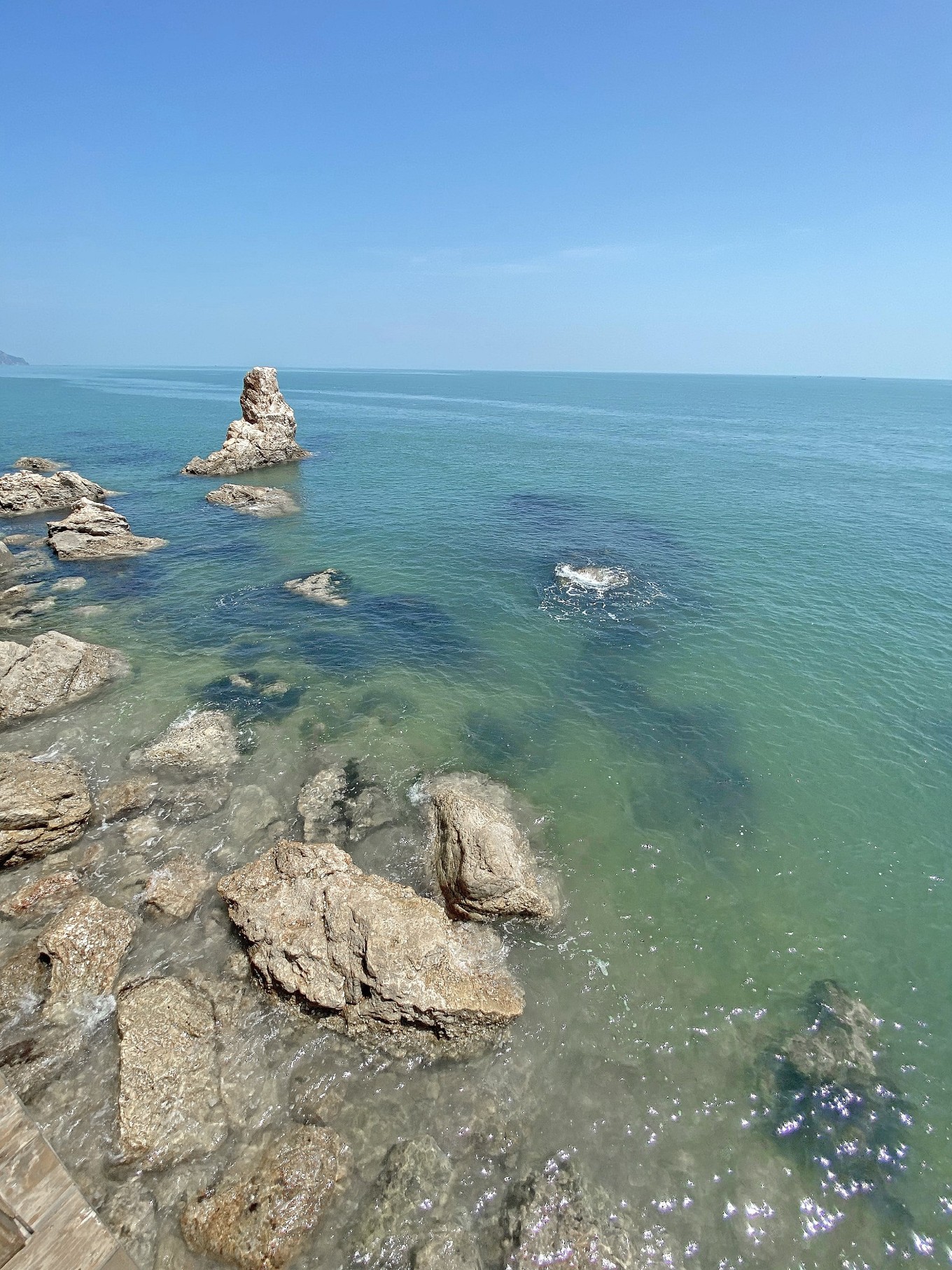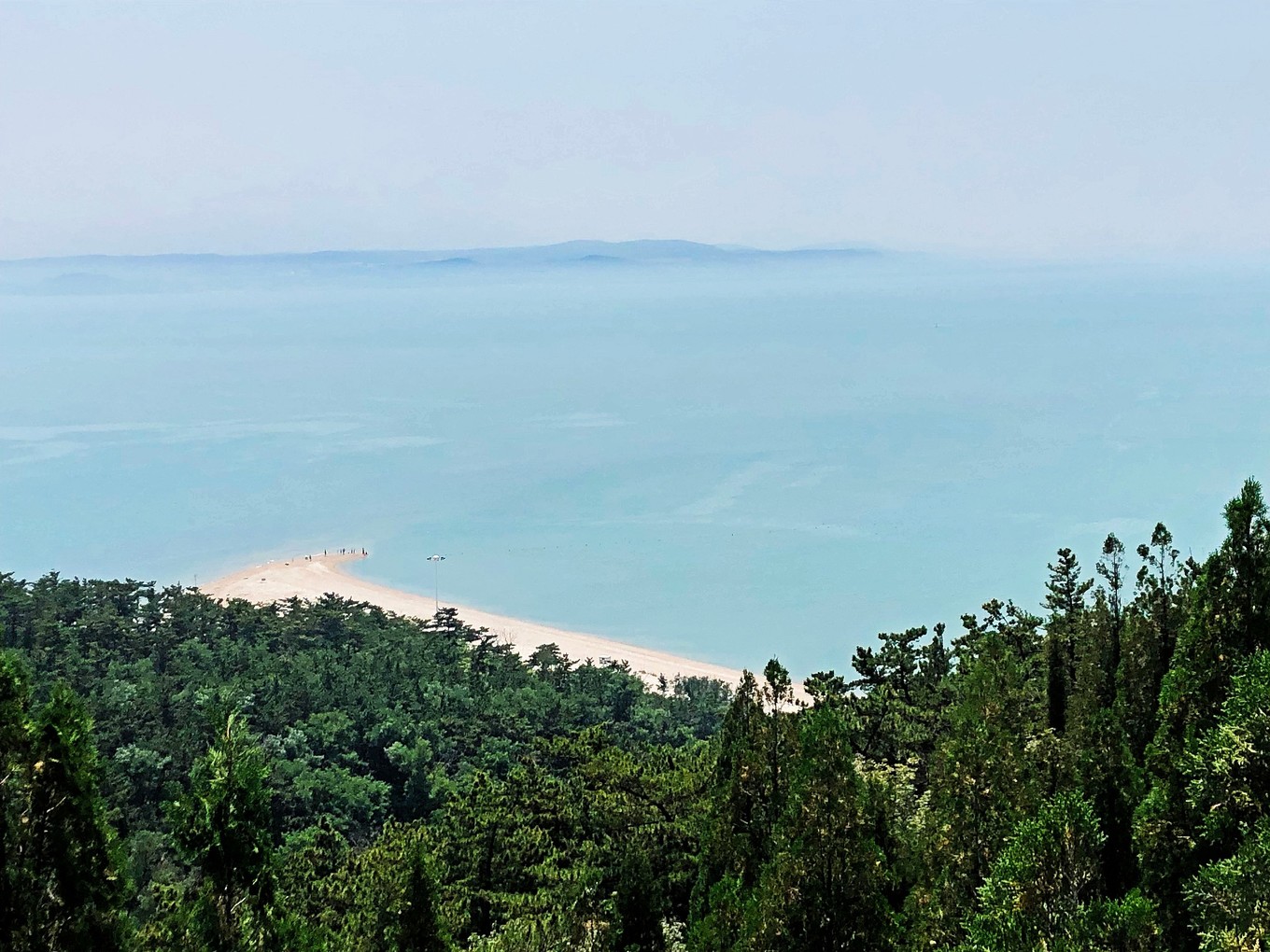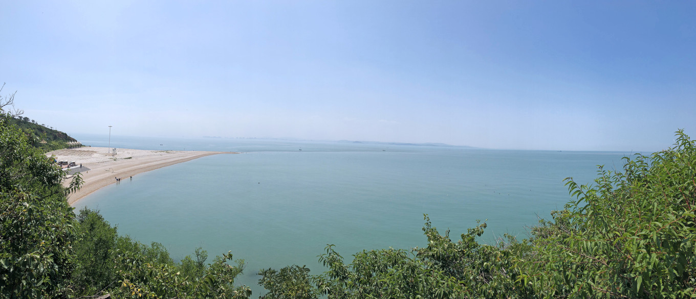 從這里往下看,可以對分界線一覽無余,從左邊那個沙灘的尖角往右望去,中間有一道深藍和淺藍的交匯處,就是黃渤海分界線了,很神奇吧!