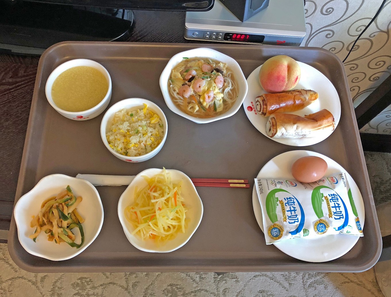 最后一天要抓緊回程了,早飯也沒有時間出去吃,就跟酒店訂了早餐給送到房間來(疫情期間餐廳不開),每份18塊錢,相當(dāng)豐盛啊,而且味道超贊,性價比很高。