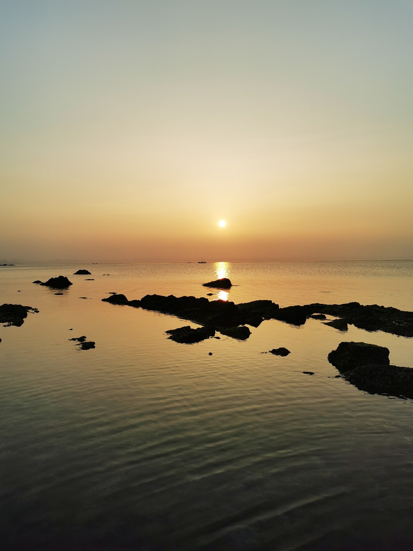 從月牙灣回到漁家樂,距離晚飯還有段時(shí)間,和姐姐在附近的海灘散散步,聊聊天。漁船??吭诟郯?,夕陽西下,溫暖的金黃色鋪滿了整個(gè)海島。