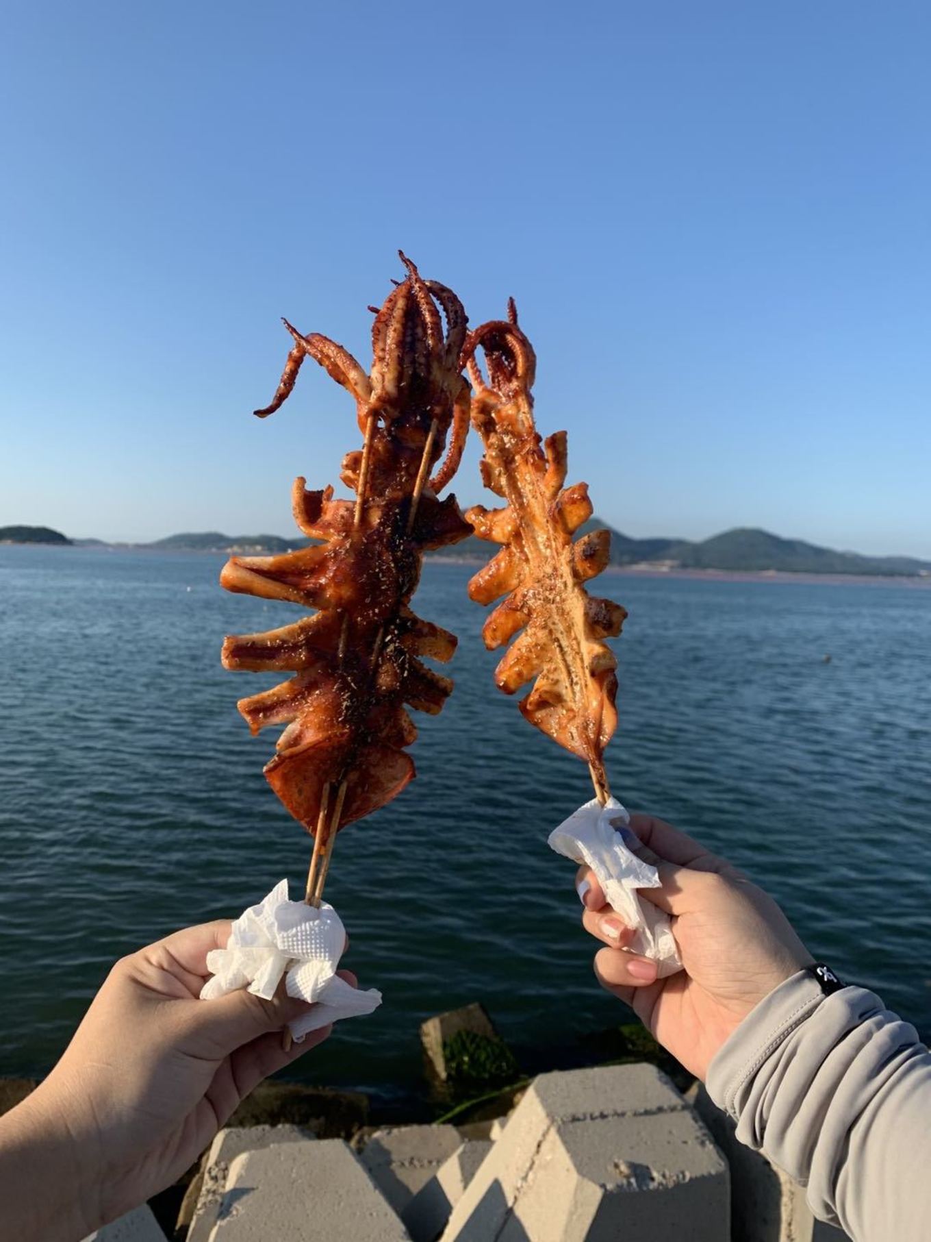 我們就轉(zhuǎn)戰(zhàn)明珠廣場那邊的出海釣魚了。可是送過去之后,那邊也不能出海了,我們就把套票里的水上自行車玩掉了,但是超級累,那個自行車太難騎了!