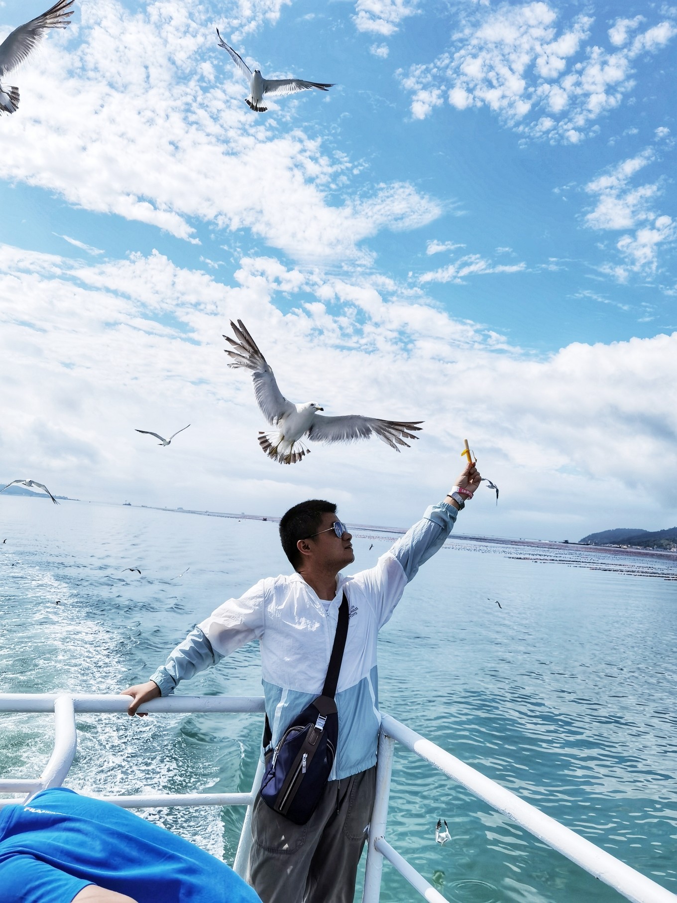 4、景點(diǎn):我買的全線聯(lián)票三天有效,本含六個景點(diǎn),但望夫憔封閉沒去。南島的烽山可鳥瞰長島全景,林海公園水質(zhì)清澈有玻璃棧道直通黃渤海交匯處,仙境源有個沙灘可帶孩子玩水。北島的月亮灣撿石頭,九丈崖觀日落。如果是聯(lián)票建議直接包車隨叫隨到,300塊錢玩遍所有景點(diǎn)。如果不打算全部玩?zhèn)€人推薦林海和九丈崖,另外不暈船的一定要去下萬鳥島(出海行程費(fèi)用另算),“升艙”到甲板58/人,會贈送魚腸,全程四小時不登島,可與海鷗近距離接觸,下層客艙在返程的時候也有15分鐘免費(fèi)上甲板體驗(yàn),超時收費(fèi),但可能會錯過成群的海鷗,聽說8月底海鷗就少了,我們此行算是抓住了旺季的尾巴。