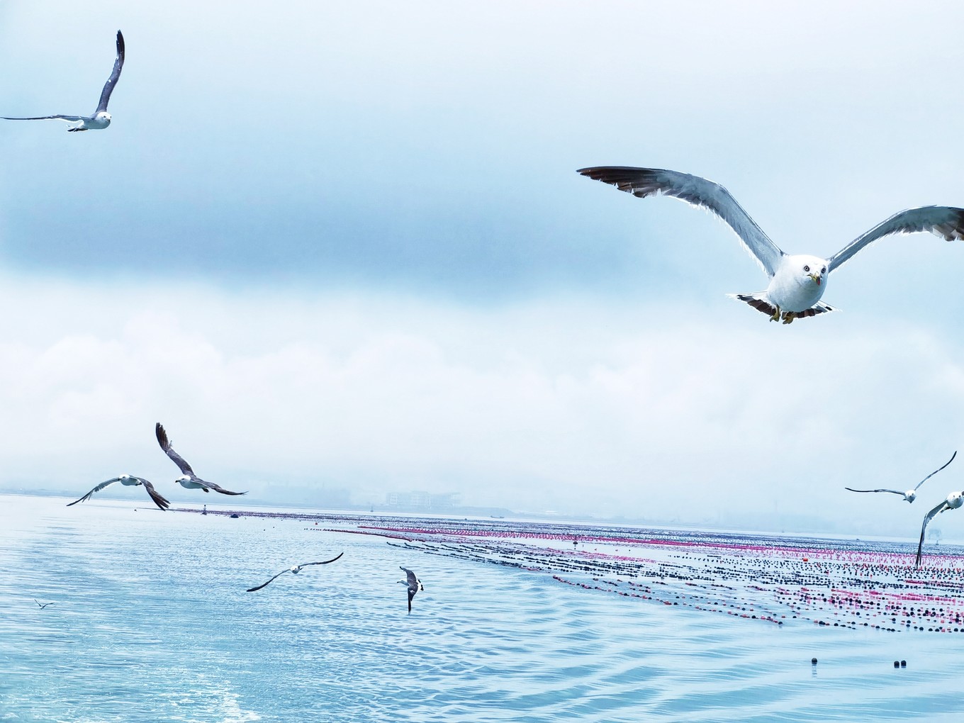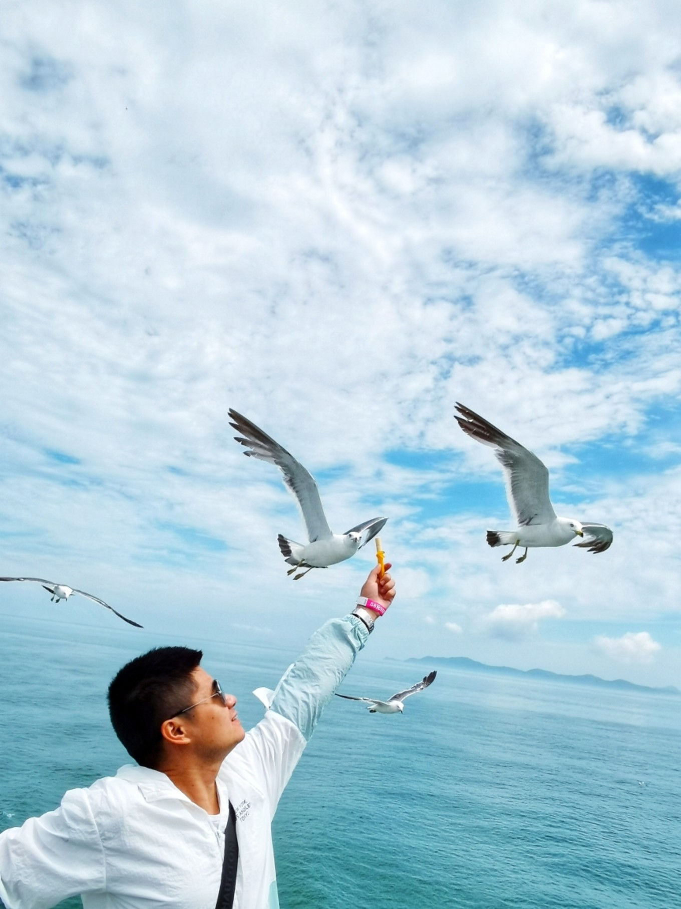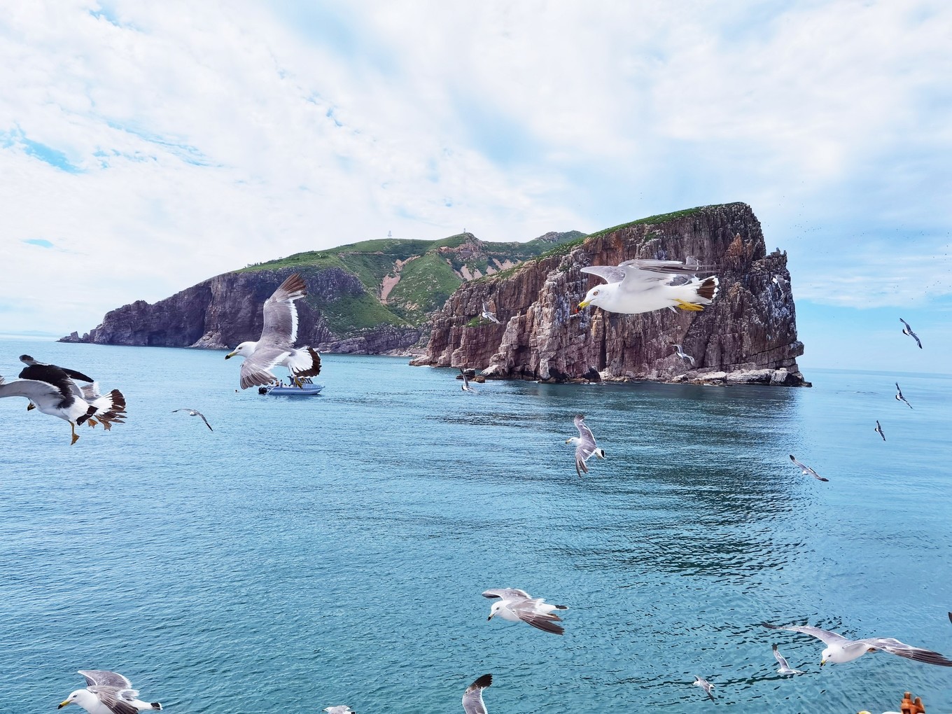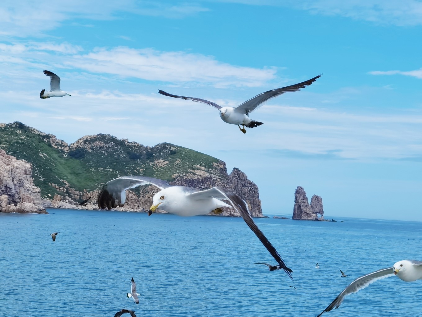 旅行于我是化解生活之苦的一劑良藥,也總想找個機(jī)會分享給所愛之人,于是乘今年疫情之際攜全家出行,考慮老人的體力,決定選擇一個特色海島,斟酌再三最終選定煙臺長島,主因是機(jī)票便宜且可以看到海鷗成群。果不其然從長島港出發(fā)沒多久就有成群的海鷗盤旋乞食,遠(yuǎn)處的長島廣告牌頗有一種闖進(jìn)好萊塢的錯覺!