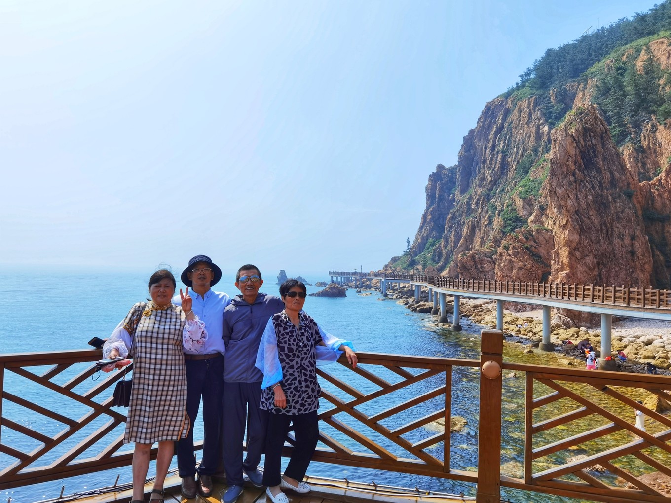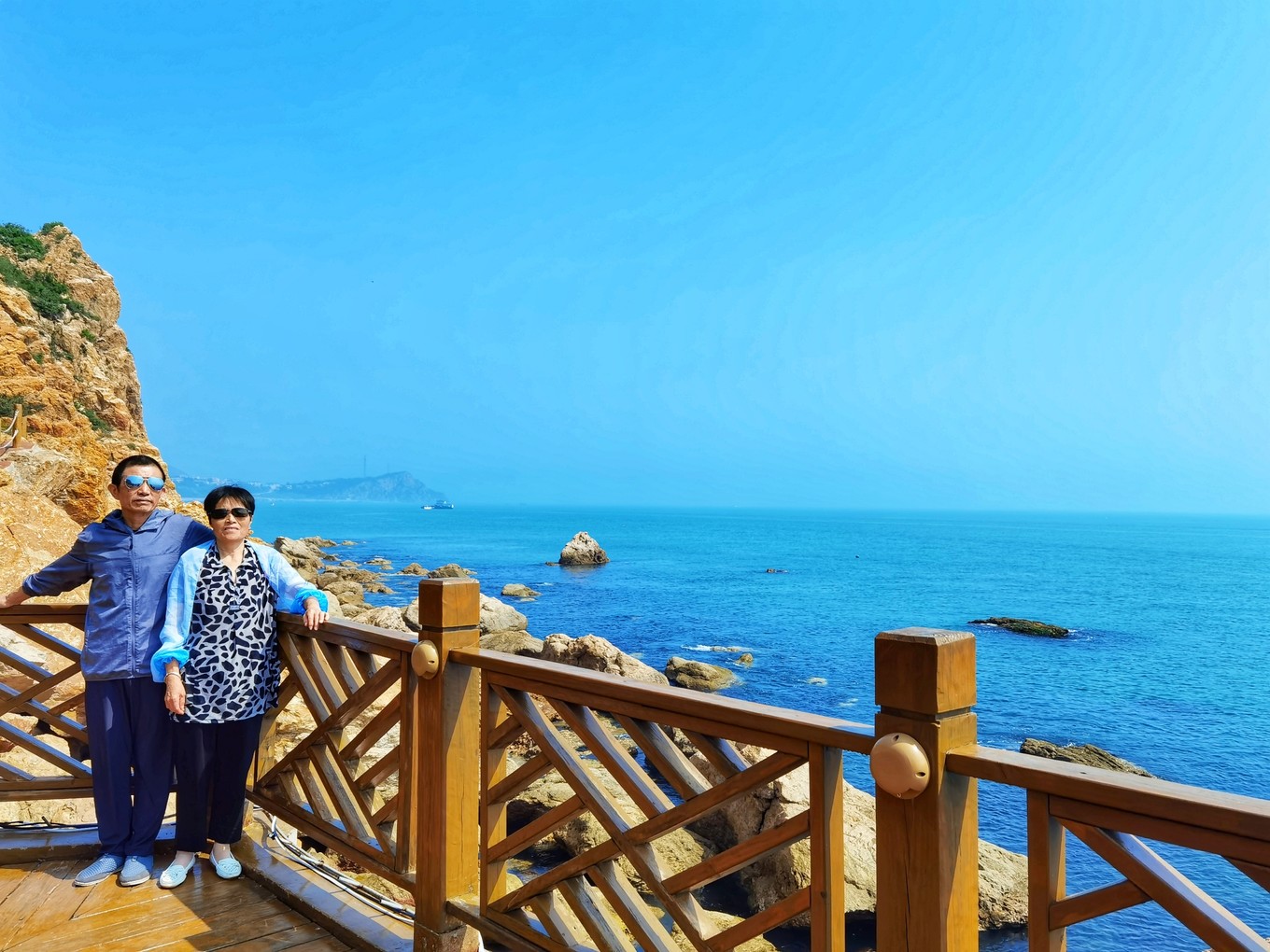 海水清澈見底,海天一色的盛景引得老人們難得主動要求留影